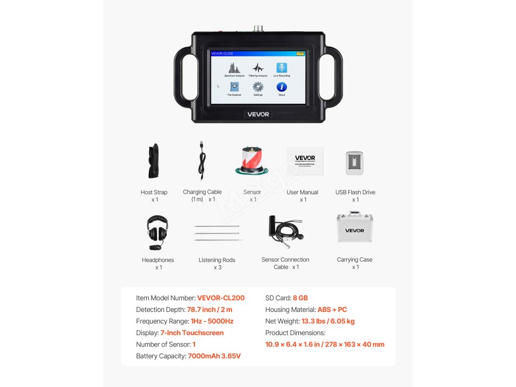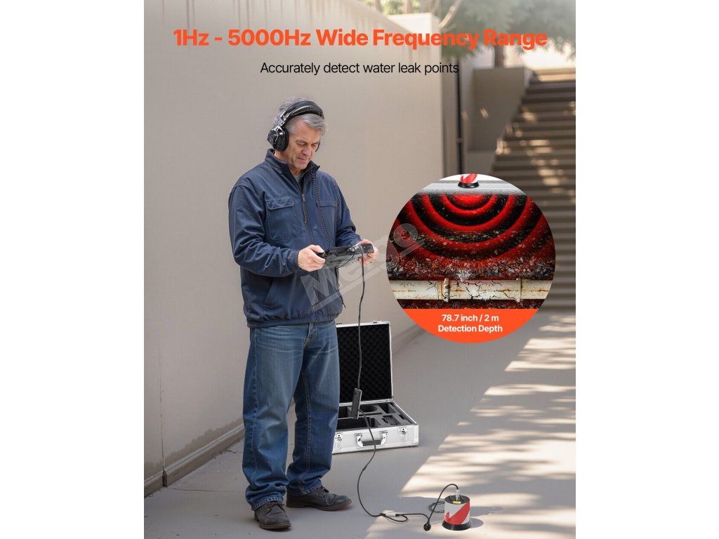 Detektor netěsností potrubí VEVOR nabízí frekvenční rozsah 1 Hz - 5 000 Hz a hloubku detekce 2 m, přičemž podporuje spektrální a filtrační analýzu. Je vybaven vysoce citlivým snímačem, 3 poslechovými lištami, sluchátky s potlačením šumu a 7palcovým dotykovým LCD displejem pro efektivní detekci úniků.