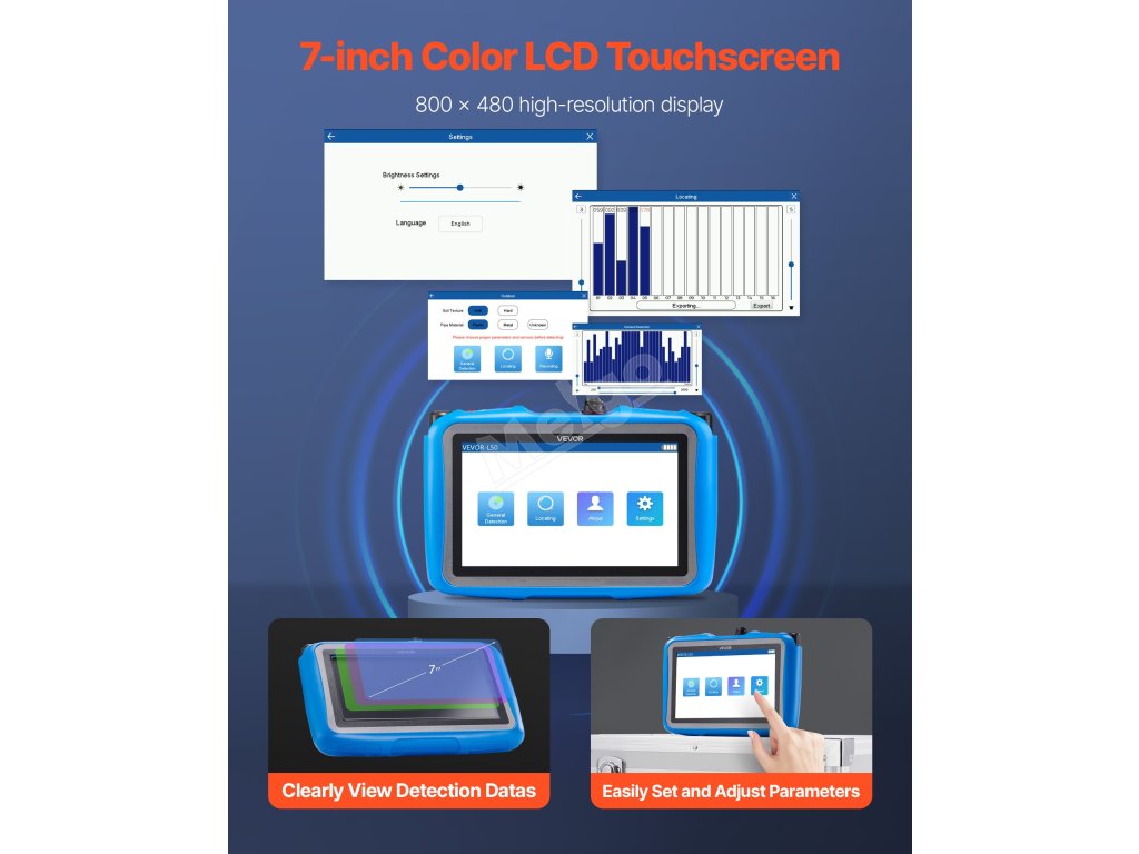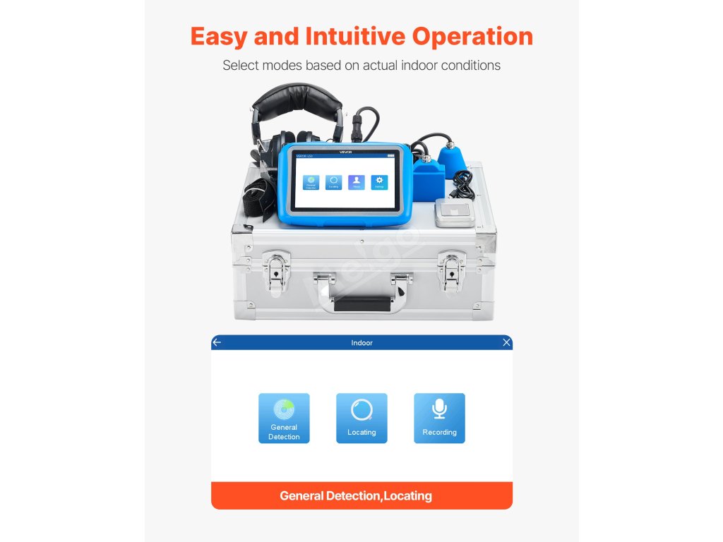 Detektor netěsností potrubí VEVOR nabízí široký frekvenční rozsah 1 Hz - 1000 Hz a hloubku detekce 0,5 m. Je vybaven horizontálními a vertikálními senzory, sluchátky s potlačením šumu, 7palcovým dotykovým displejem a vysokokapacitní baterií s kapacitou 8 000 mAh pro přesnou a efektivní detekci úniků v domácnosti.