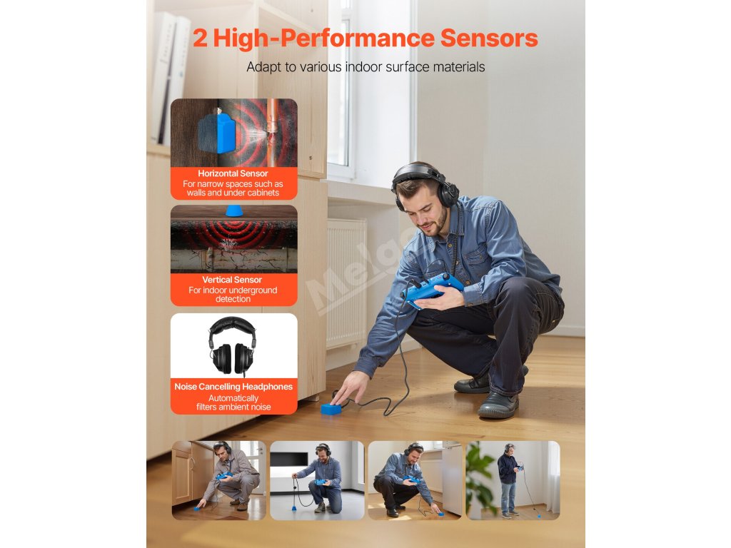 Tento detektor netěsností potrubí je vybaven horizontálními a vertikálními senzory a je vhodný pro většinu domácích interiérů. Přesně identifikuje úniky z potrubí, šetří vodní zdroje, prodlužuje životnost potrubí a snižuje ztráty.