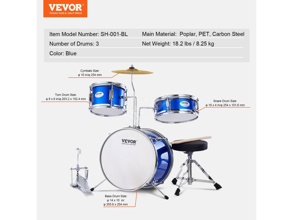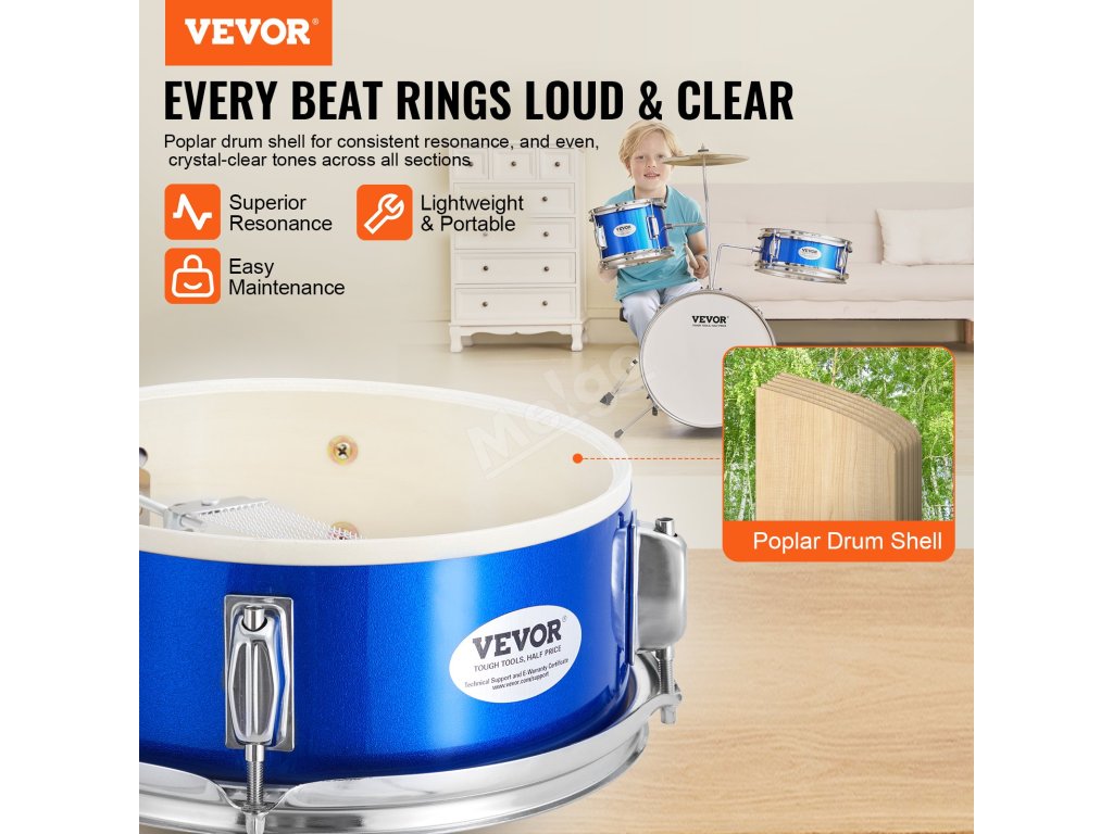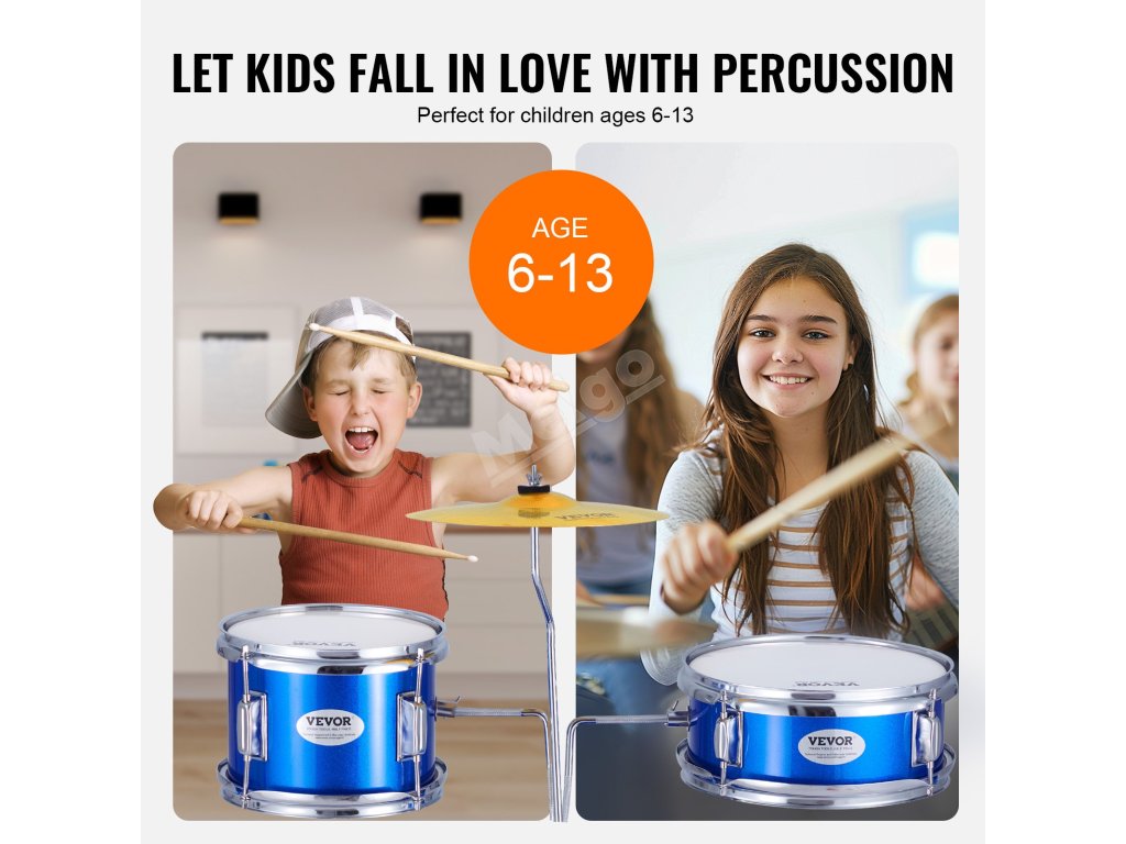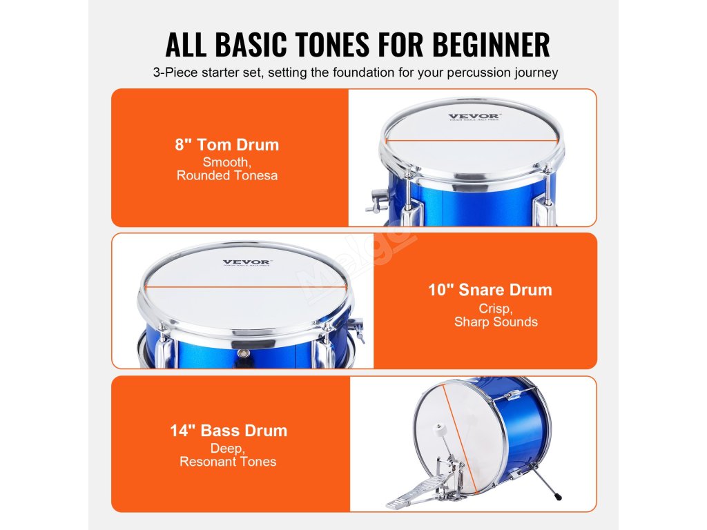 Naše dětská bicí souprava určená pro děti od 6 do 13 let obsahuje 8'' tom buben, 10'' snare buben a 14'' basový buben. Díky kvalitním topolovým korpusům a PET bubenickým hlavám mají naše bubny čistý a dynamický zvuk. Zvyšte hudební zážitek svého dítěte hned teď!