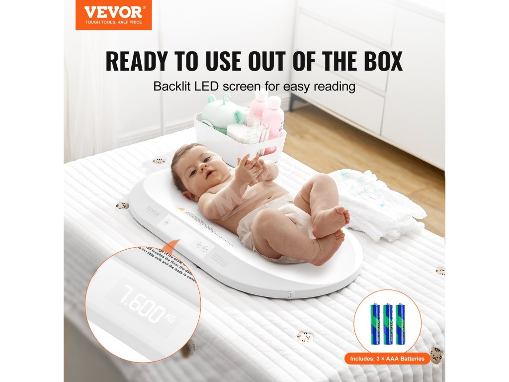 Tato digitální dětská váha je vybavena podsvíceným LCD displejem a nabízí jasný přehled o naměřených hodnotách. Obsahuje 3 baterie AAA, automatické vypnutí, funkci automatického podržení, funkci tárování a více jednotek (g/kg/oz/lb/lb) pro rychlé, přesné a všestranné měření.