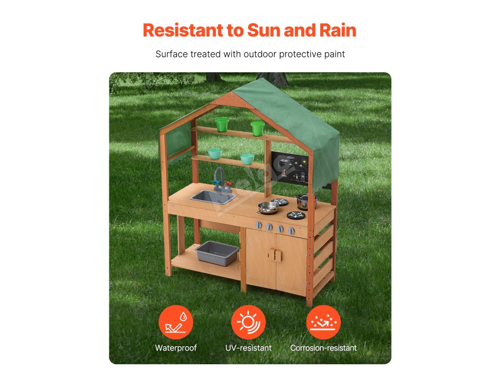 Tato kuchyňka pro batolata je opatřena vnějším nátěrem odolným proti vodě a korozi a poskytuje dětem zastíněný prostor na hraní. Je ideální pro použití na zahradách, dvorech a trávnících.