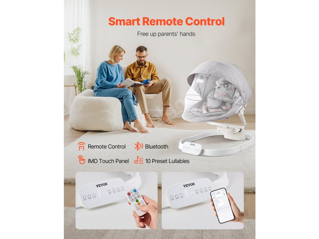Nabízí 3 možnosti ovládání podle vašich potřeb. Dálkové ovládání umožňuje dálkově nastavit rychlost přehrávání hudby a houpání. Můžete si vybrat z 10 přednastavených ukolébavek nebo se připojit přes Bluetooth a přehrávat hudbu z telefonu ; Dotykový panel IMD přehledně zobrazuje funkce, což usnadňuje ovládání novým rodičům.
