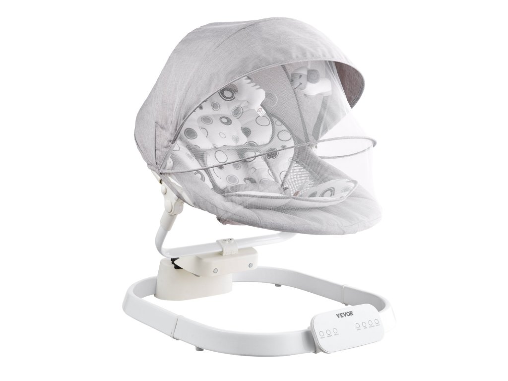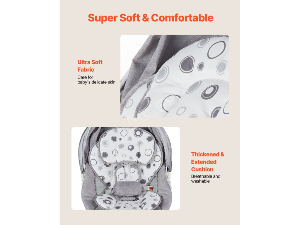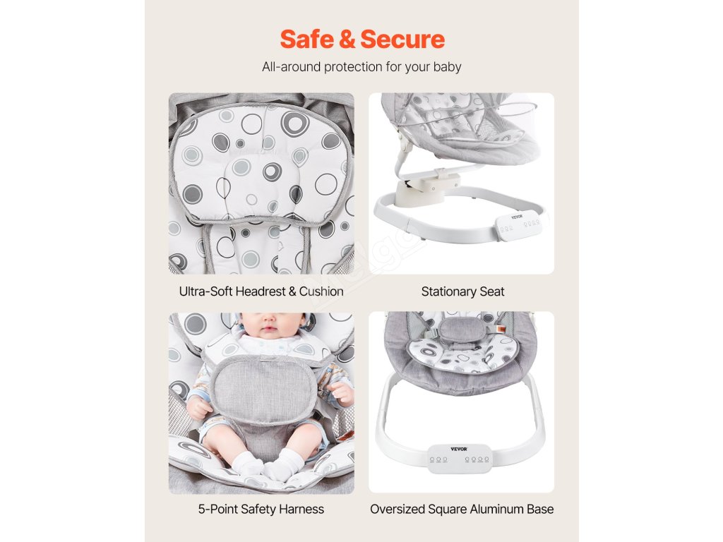 Naše dětská houpačka má stabilní hliníkovou základnu, pětibodové bezpečnostní pásy s nastavitelnými ramenními vycpávkami, vyztuženou opěrku hlavy a polstrovanou podložku pro maximální pohodlí a bezpečnost. Odnímatelná moskytiéra poskytuje dodatečnou ochranu při použití venku, 2 rozkošné hračky rozvíjejí motorické schopnosti dítěte.