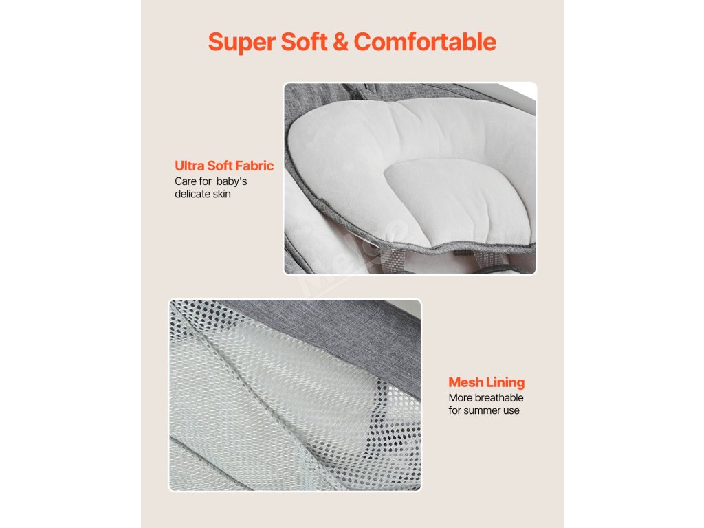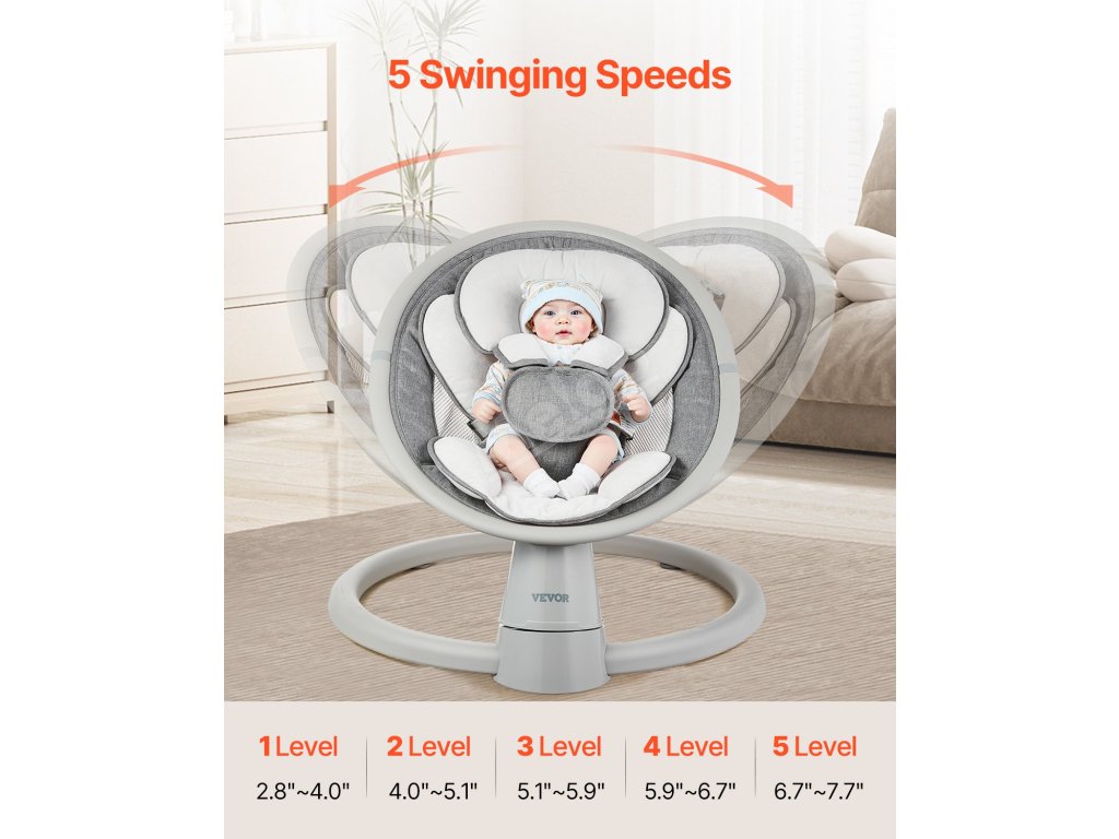 Tato kompaktní dětská houpačka váží pouhých 8,16 kg, takže ji lze snadno složit a vzít kamkoli s sebou. Je napájena 4 bateriemi AAA (nejsou součástí dodávky), USB nebo elektrickým napájením pomocí 2 m dlouhého napájecího kabelu a je ideální pro vnitřní i venkovní použití, což z ní činí přenosnou dětskou houpačku pro rodiče na cestách.
