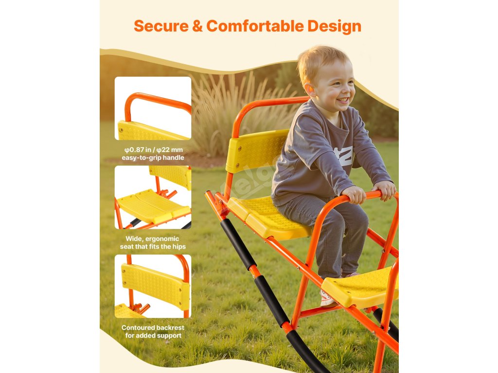 Široké sedadlo a pohodlné opěradlo houpačky zaručují hodiny hraní bez nepohodlí. Snadno uchopitelné rukojeti φ25 mm udržují malé ruce během hry v bezpečí a poskytují rodičům klid.