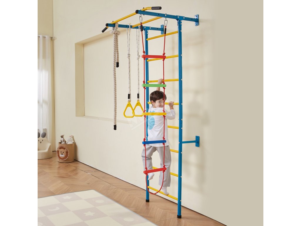 Každá součást je jasně označena pro rychlou identifikaci, což usnadňuje instalaci. K instalaci této vnitřní tělocvičny pro děti stačí jedna stěna. Je ideální pro dětské pokoje, školky a vzdělávací centra. Standardní vyvrtané otvory a robustní šrouby zajišťují stabilní spojení.
