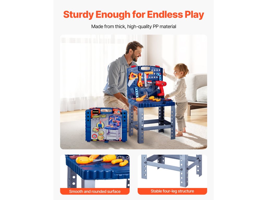 Náš dětský stolek na nářadí je vyroben z odolného, hladkého dřeva a vydrží dlouho. Jeho stabilní konstrukce vydrží živou dětskou hru a nemá žádné ostré hrany pro větší bezpečnost při hře.