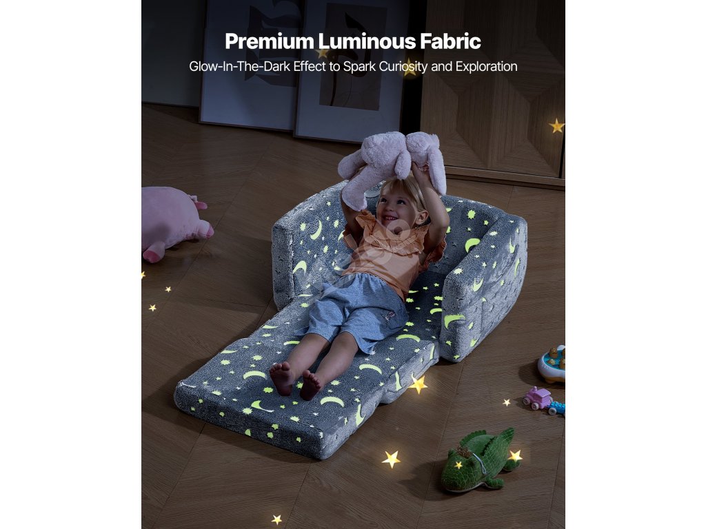 Tato dětská pohovka poskytuje útulný a hravý prostor pro odpočinek, hru nebo relaxaci dětí. Je vyrobena z měkké flanelové tkaniny se vzory svítícími ve tmě a je stejně zábavná jako pohodlná. Je vyplněna vysoce odolnou 28D pěnou, která poskytuje měkkou oporu po celý den
