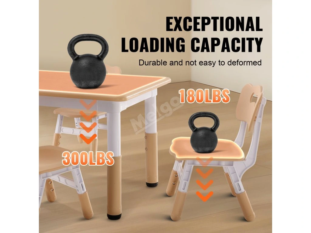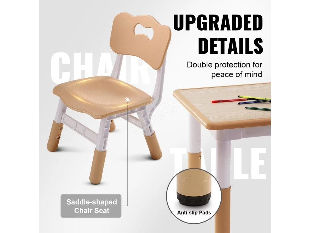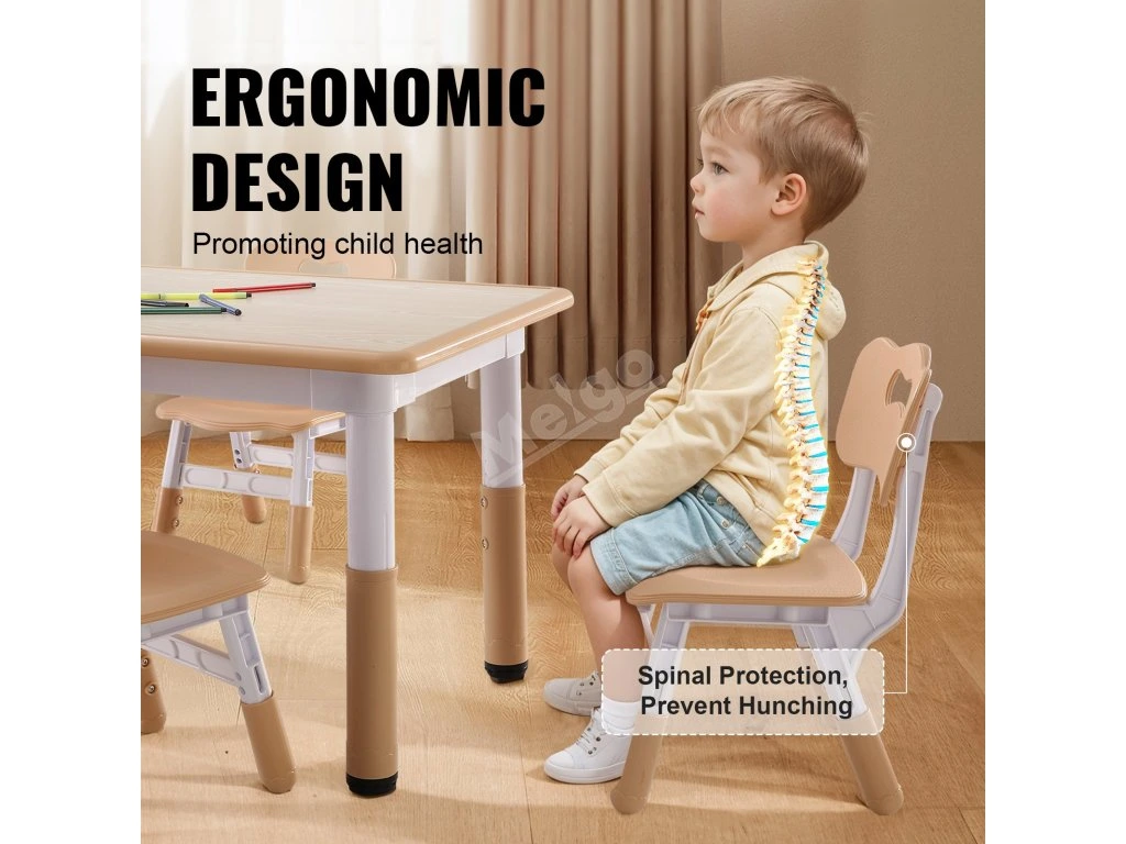 Naše sada stolu a židle pro batolata zohledňuje výšku, tělesnou velikost a potřeby dětí při učení. Výškový rozdíl chrání oči dětí a umožňuje jim pohodlně sedět, ať už si hrají, kreslí nebo čtou. Pomáhá také předcházet deformacím páteře.