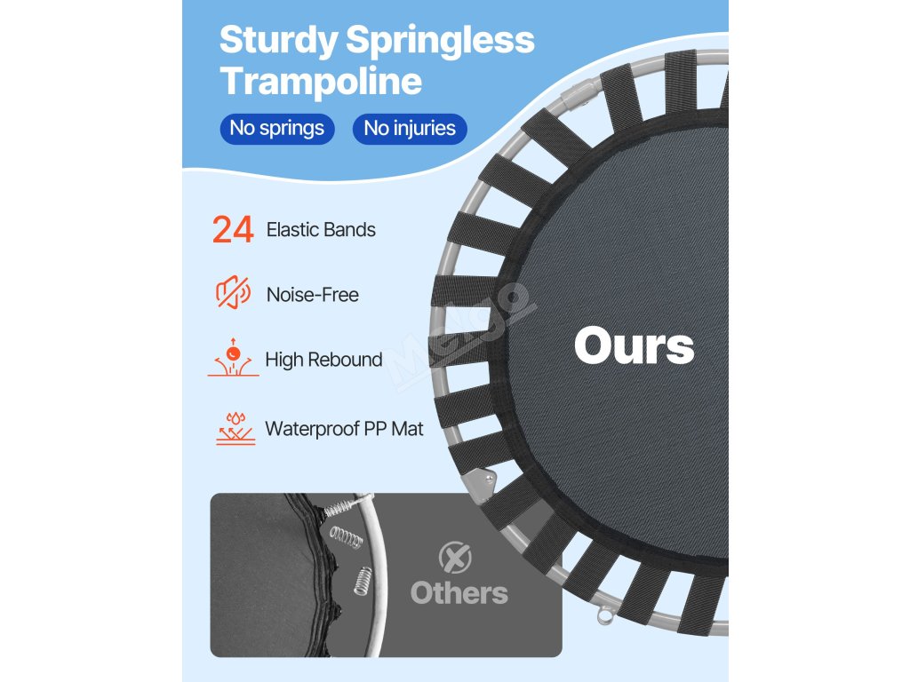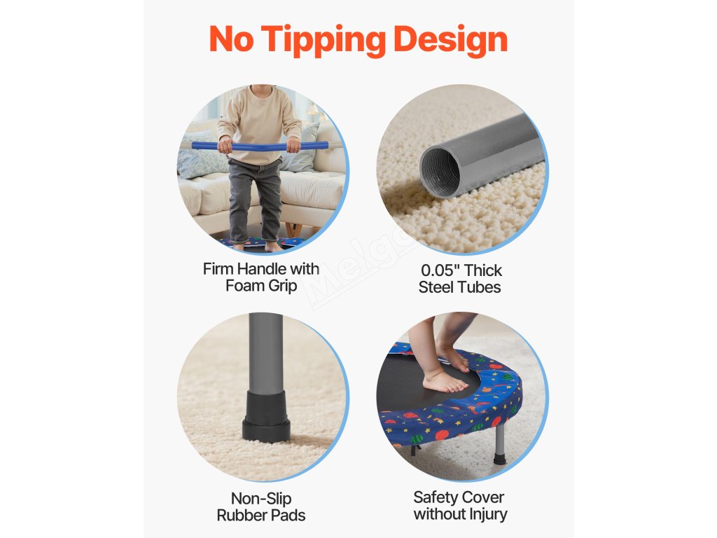 Trampolína pro batolata je vyrobena s odolným rámem, PP skákací podložkou a bezpečnostní podložkou, plochými pružnými pásy, trubkami na nohy s gumovou hlavou a rukojeťmi potaženými pěnou, což zajišťuje robustnost a odolnost a zároveň snadné čištění a údržbu. Gumové podložky pod nohy zajišťují tlumení pro tichý provoz.