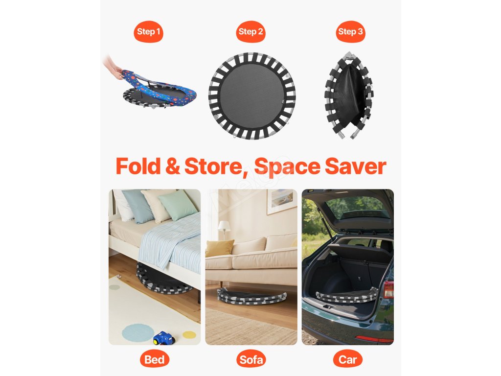 Díky skládací konstrukci se naše mini dětská trampolína pro batolata snadno přenáší, takže děti mohou skákat, kdekoli se jim zlíbí. Pro úsporu místa ji lze uložit pod pohovku nebo do kufru auta.