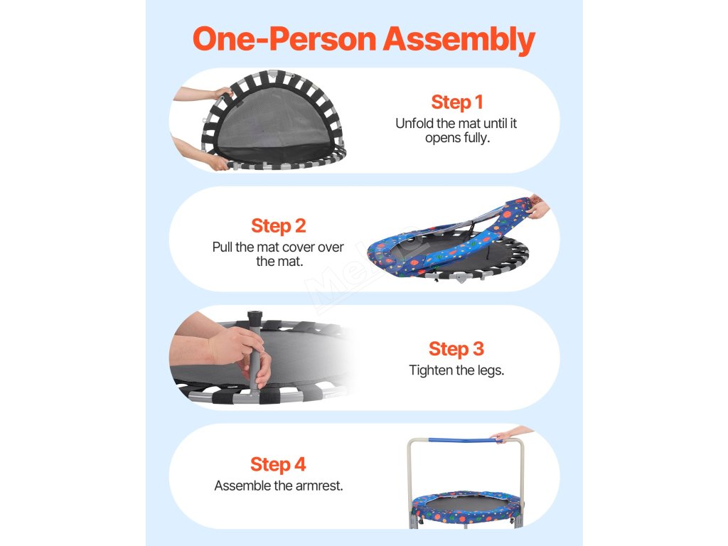 K sestavení trampolíny pro batolata je zapotřebí pouze jedna dospělá osoba. Podle návodu sestavte rám, utáhněte nohy a připevněte podložku ke skákacímu rámu. Montážní otvory a závity jsou přesně přizpůsobeny pro instalaci v jednom kroku.