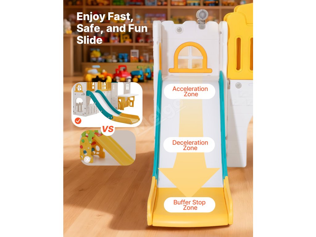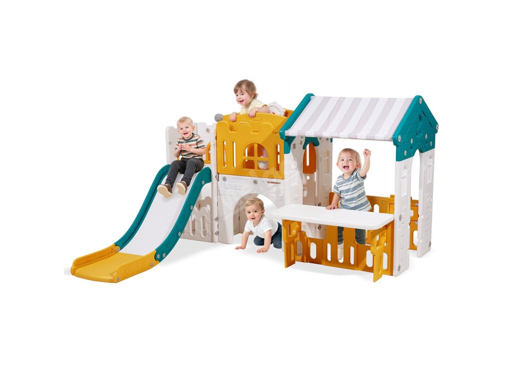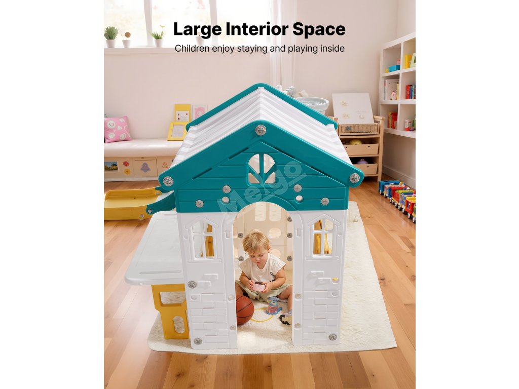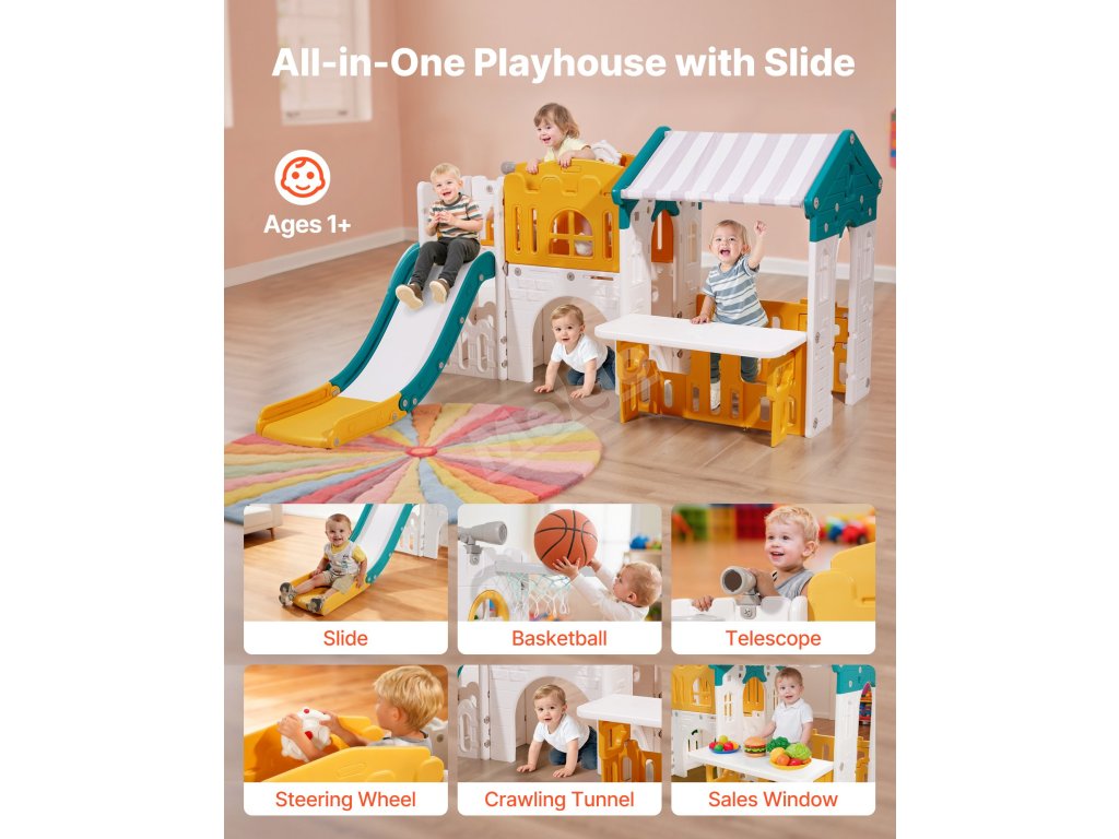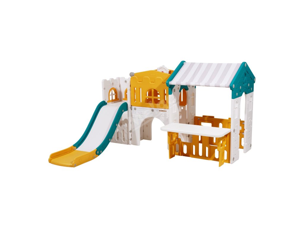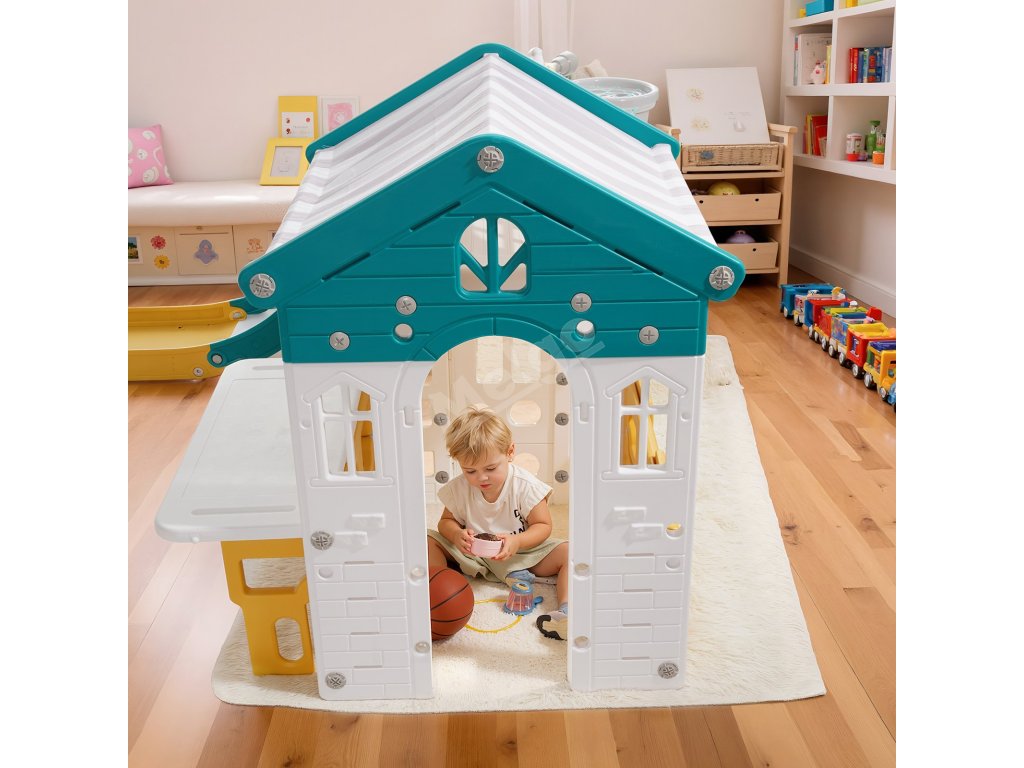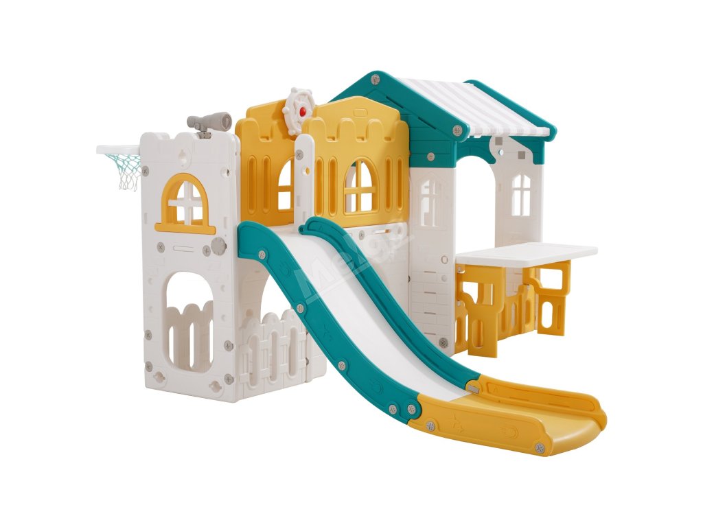 Tento venkovní hrací domeček se skluzavkou, lezeckým mostem, basketbalovým košem, volantem, teleskopem a stolem pro aktivity podporuje kreativitu při tvorbě scénáře. Děti se mohou zapojit do předstíraného řízení, řízení obchodu a aktivní hry, která je udrží v pohybu a zabaví na dlouhé hodiny.