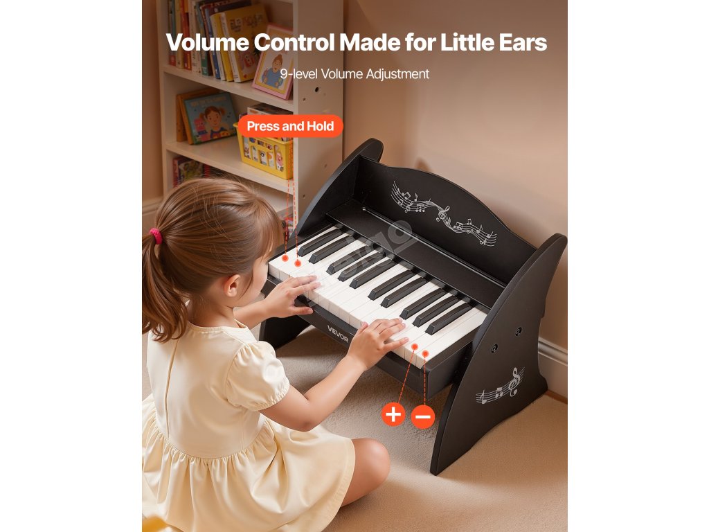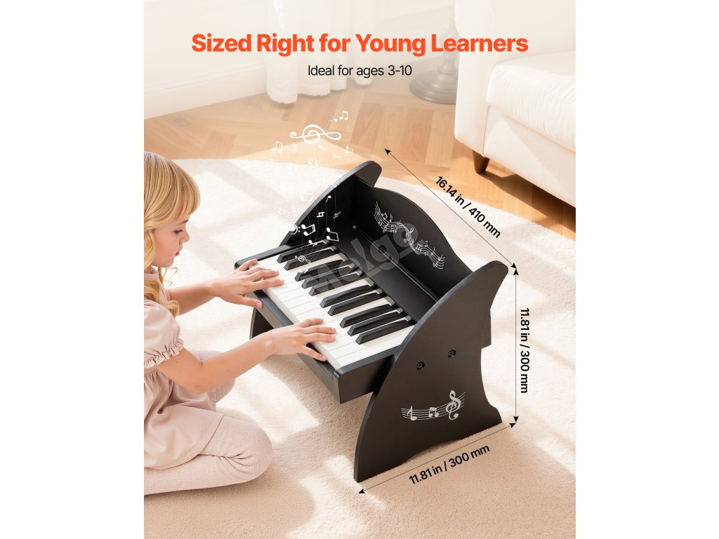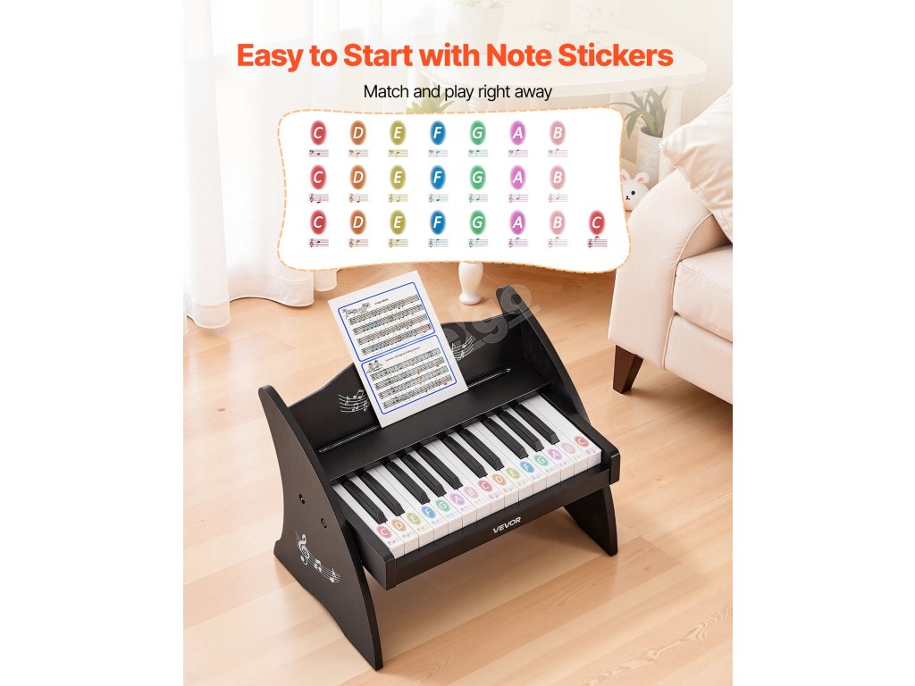 Toto dětské dřevěné piano nabízí tichý a praktický způsob, jak zkoumat zvuky. Přirozeně zapadá do rodinného života, snadno se sestavuje, jednoduše se používá a je vždy připraveno, když dítě pocítí zvědavost zahrát pár tónů.