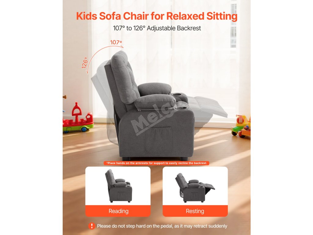 Tato dětská židle má silné a měkké opěradlo, široké a pohodlné područky, vysoce pružný sedák a výsuvnou opěrku nohou, takže se dětem skvěle sedí.