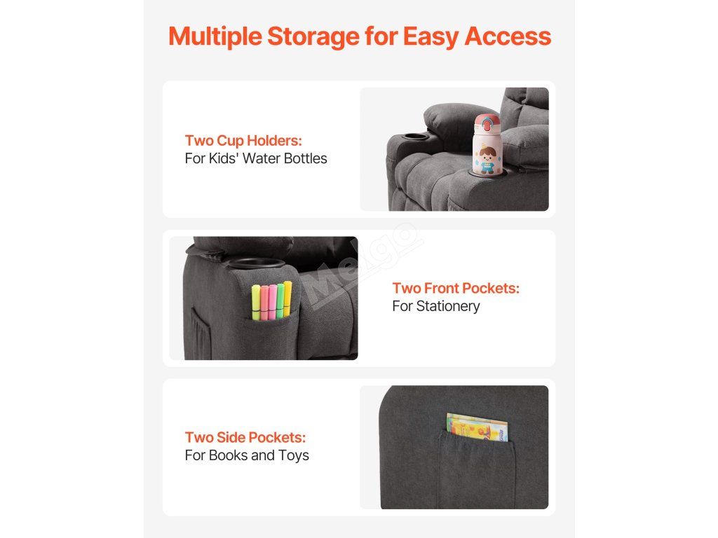 Dětská autosedačka je navržena s odolnými držáky na nápoje na obou stranách, aby byly dětské pohárky v bezpečí. Do větší boční kapsy lze uložit dětské knížky nebo hračky a malou přední kapsu lze použít k uložení tužek a psacích potřeb.