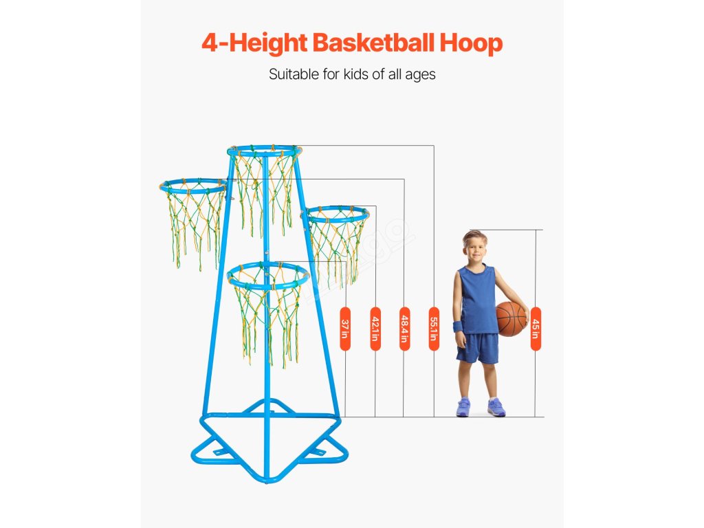 Dětský basketbalový koš má čtyři výšky obroučky: díky tomu je vhodný pro děti různého věku: 37 palců, 42,1 palce, 48,4 palce a 55,1 palce.