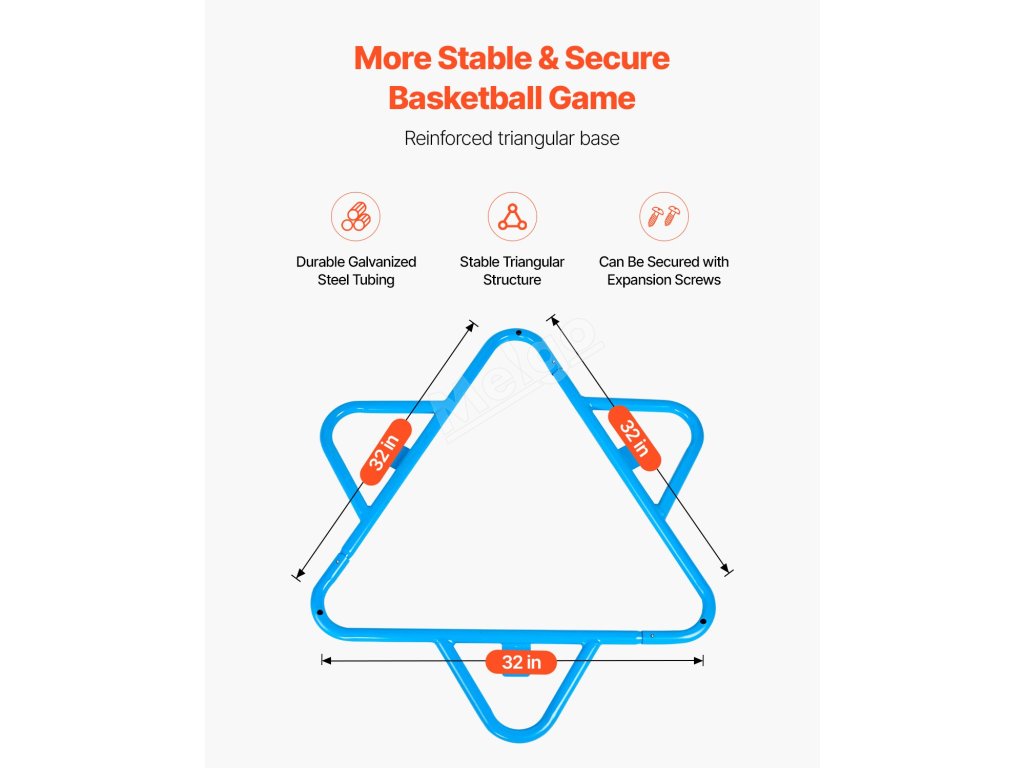 Dětský basketbalový koš je vyroben z kovu a má zesílenou trojúhelníkovou základnu, která zajišťuje stabilitu a bezpečnost, což je zárukou bezpečné hry pro děti.