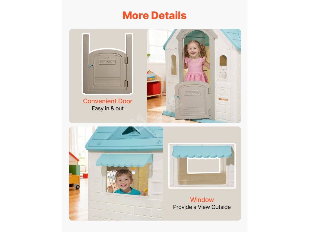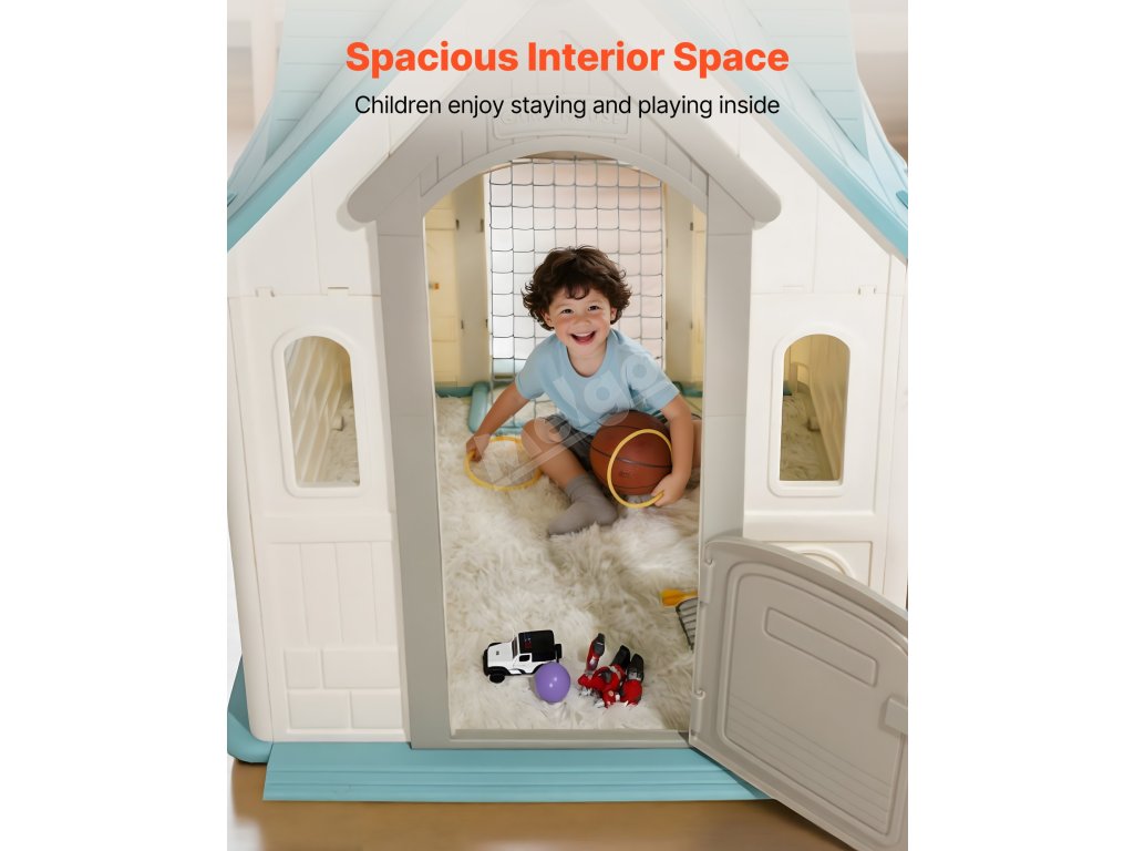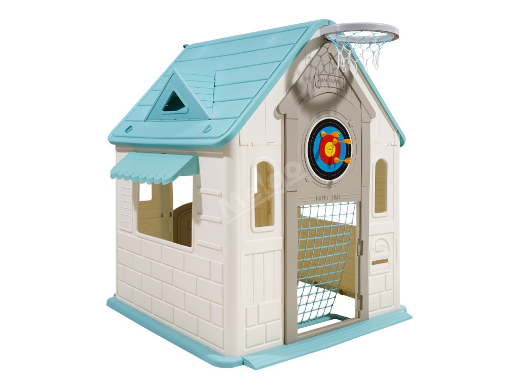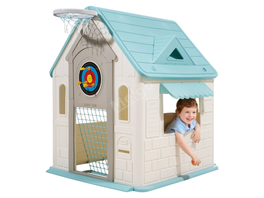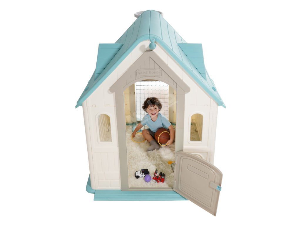 Tento vnitřní a venkovní hrací domeček nabízí řadu aktivit - od střílení na obruč po kopání do míče a házení kroužků. Děti se také mohou zapojit do nápaditého hraní rolí a zároveň zlepšovat koordinaci, rovnováhu a hrubou motoriku prostřednictvím aktivních a zábavných úkolů.