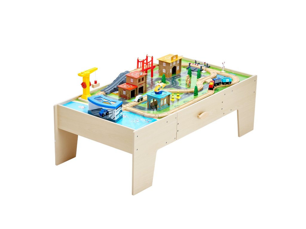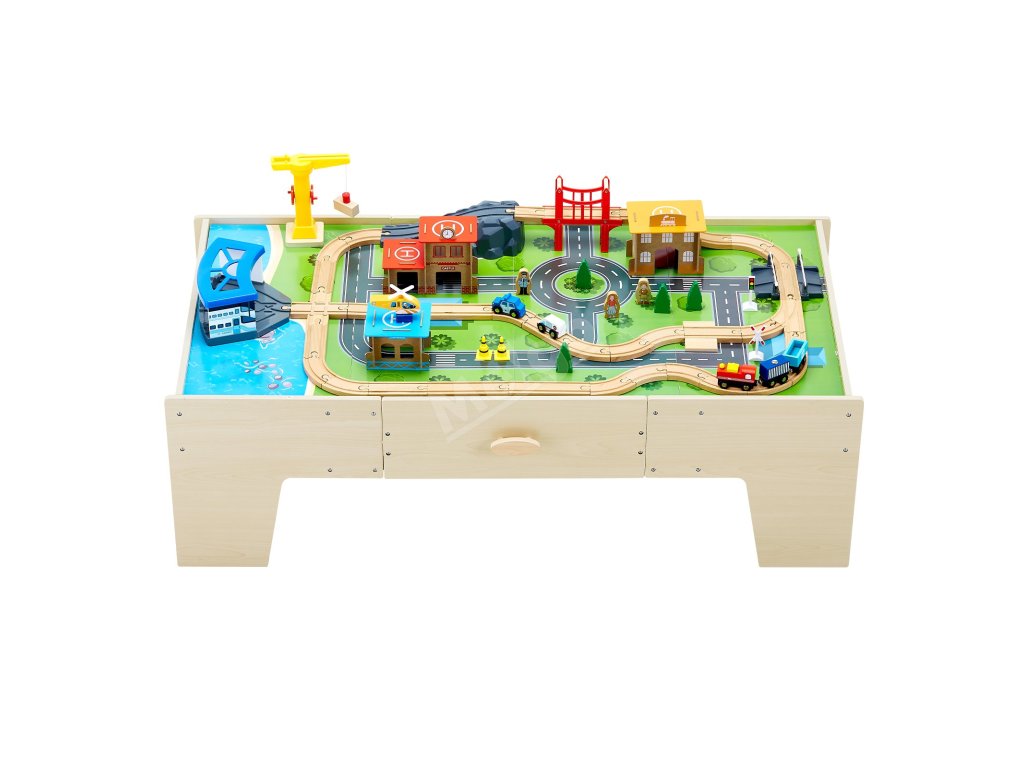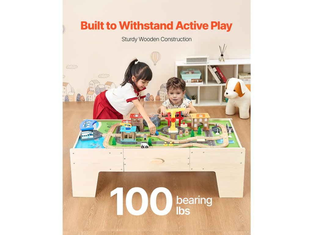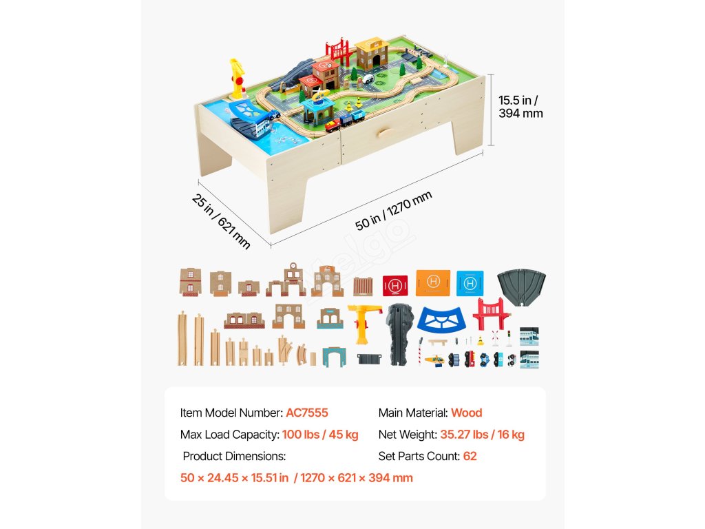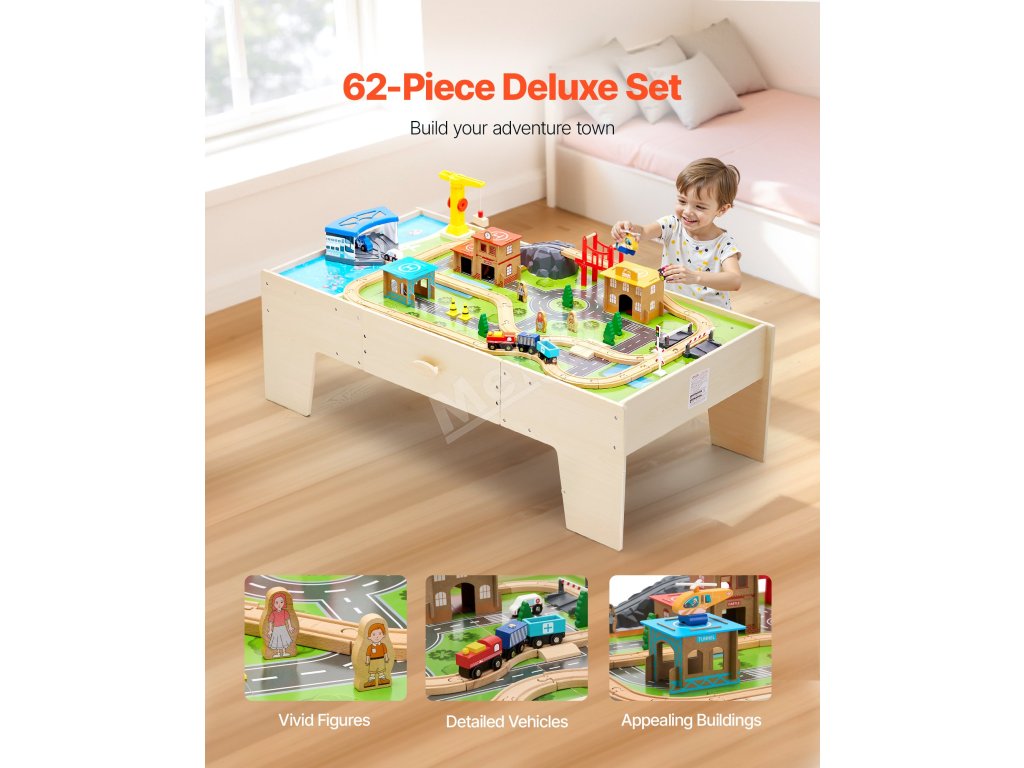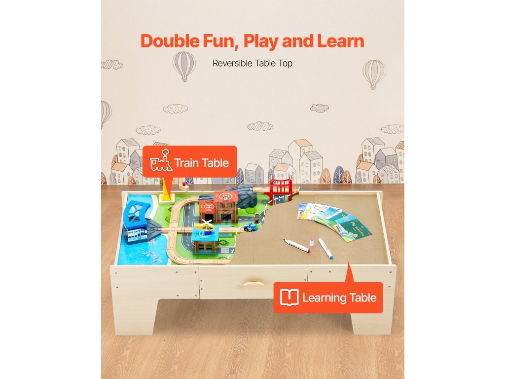 Tento 62dílný vláčkodráhový stůl má oboustranný design: barevnou mapu na hraní a hladký povrch na učení. Má robustní dřevěnou konstrukci, unese až 100 kg a obsahuje úložnou zásuvku pro snadnou organizaci.