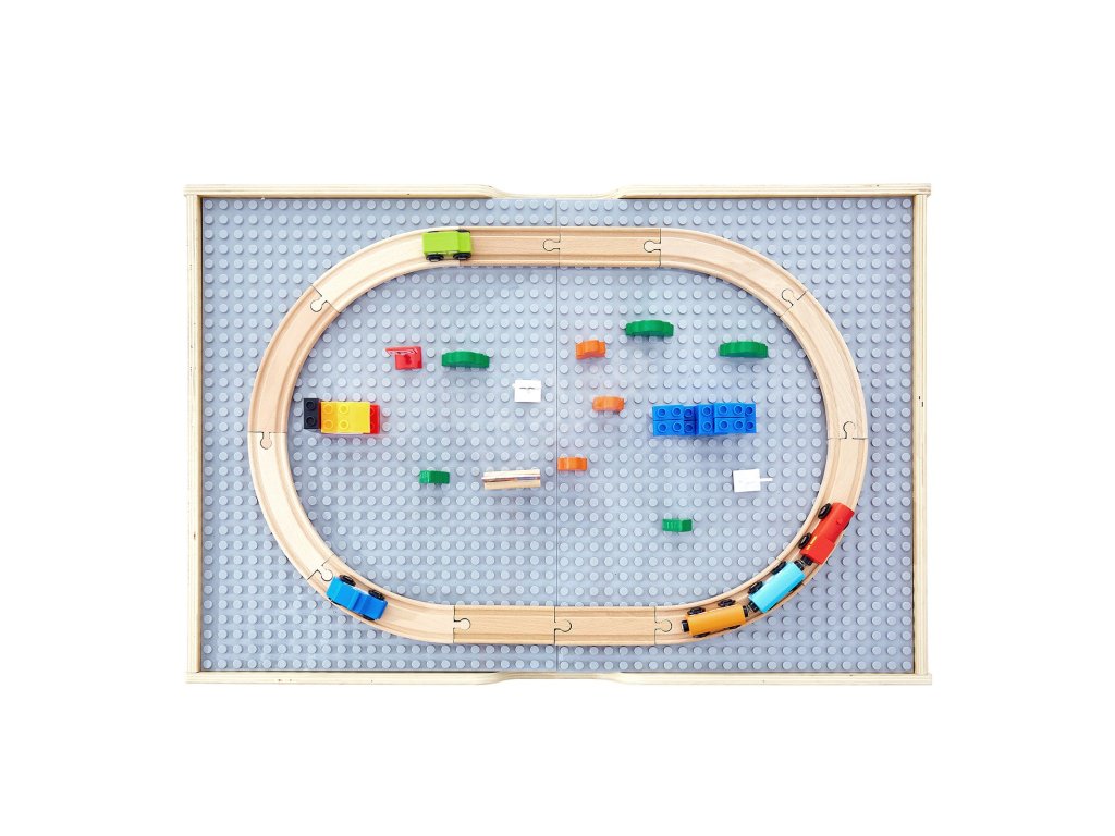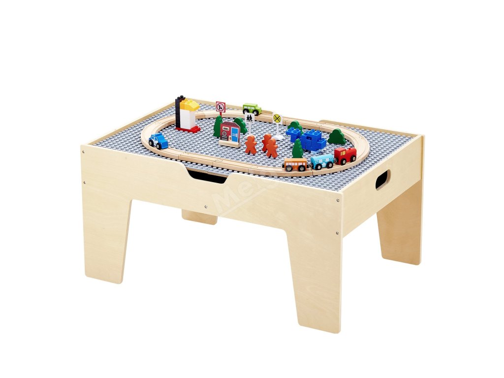 Tento všestranný stůl na hraní obsahuje dvě oboustranné desky a šedý podstavec, který slouží jako stolek na stavění kostek, stolek na hraní s vláčky, stolek na písek, studijní stolek nebo stolek na psaní křídou. Je kompatibilní s hlavními značkami kostek a představuje praktickou, prostorově úspornou variantu pro zábavu v domácnosti.