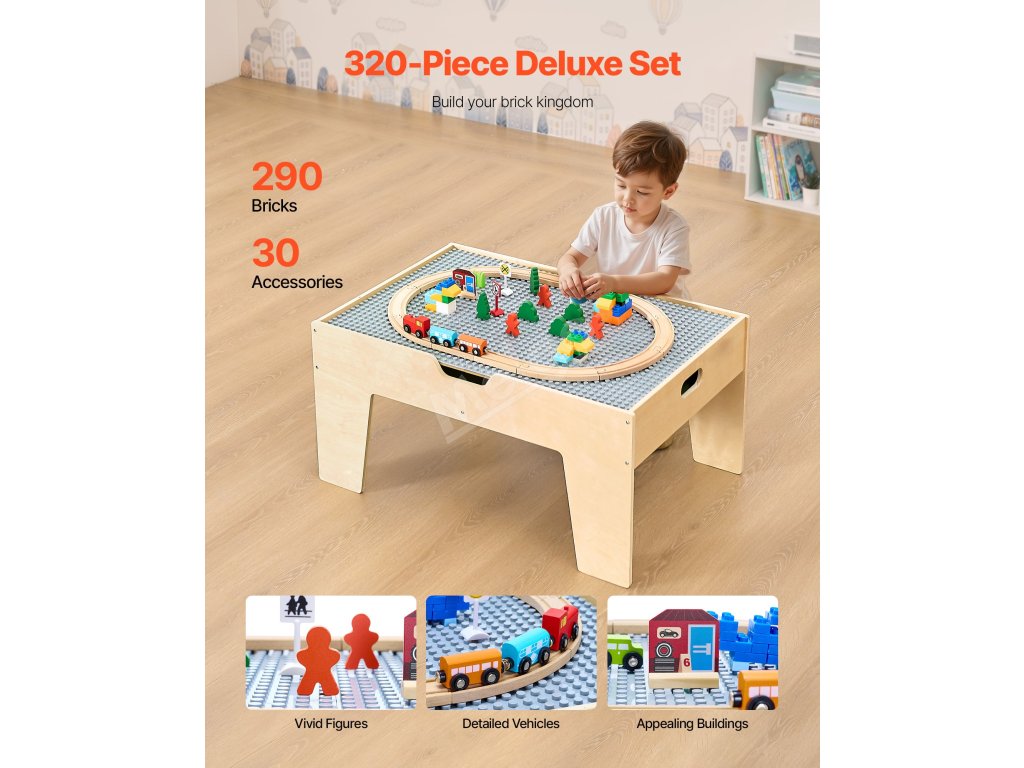 Dětský herní stůl, 290 kostek, 30-dílná dřevěná vláčková sada, 3+