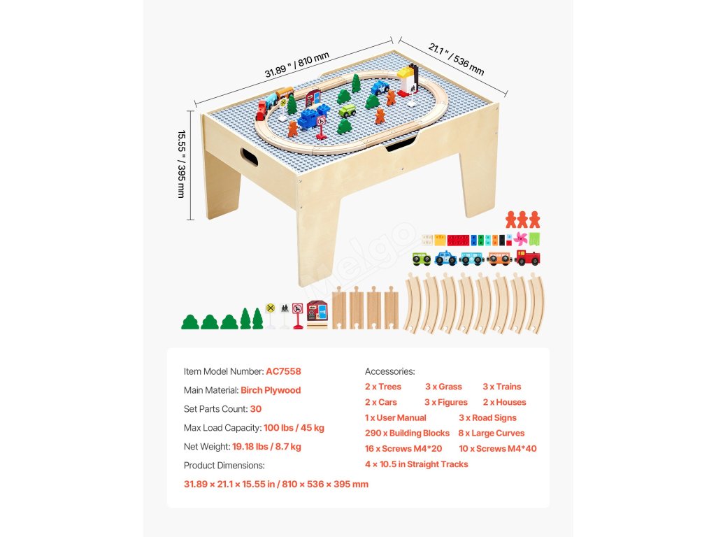 Tento multifunkční vláčkodráha obsahuje 320 dílků navržených tak, aby podněcovaly kreativitu a zlepšovaly prostorové myšlení. Je vyroben z odolného březového dřeva, unese až 100 kg a má zaoblené rohy. Dutá deska stolu poskytuje úložný prostor, takže se jedná o zábavný a rozvojový dárek.