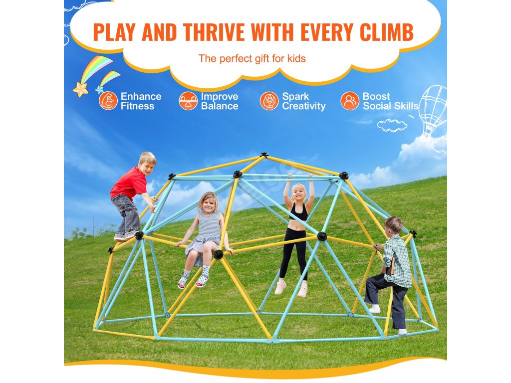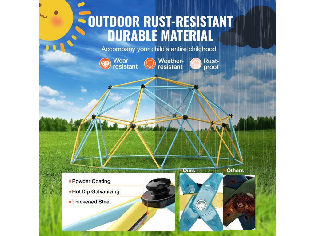 Naše venkovní lezecká kopule vyrobená z vyztužené oceli a ošetřená žárovým zinkováním a barvou poskytuje lepší ochranu proti UV záření, rzi a korozi. Je ideální pro venkovní použití a provází vaše dítě šťastným dětstvím.