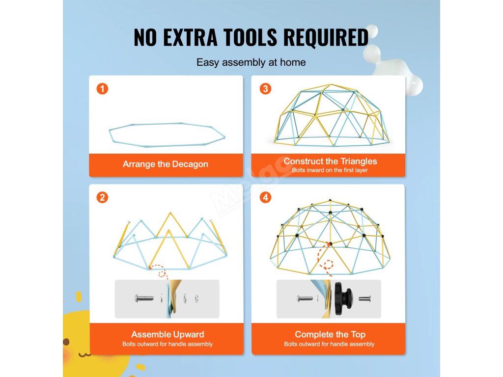 Naše dětská lezecká kopule obsahuje montážní nástroje, průvodce krok za krokem a videonávody pro bezproblémovou montáž. Strávíte méně času sestavováním a více času zábavou s dětmi. Postupujte podle našich pokynů a sestavte dárek společně!