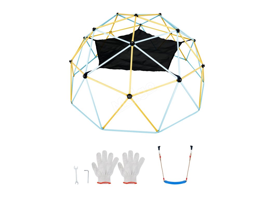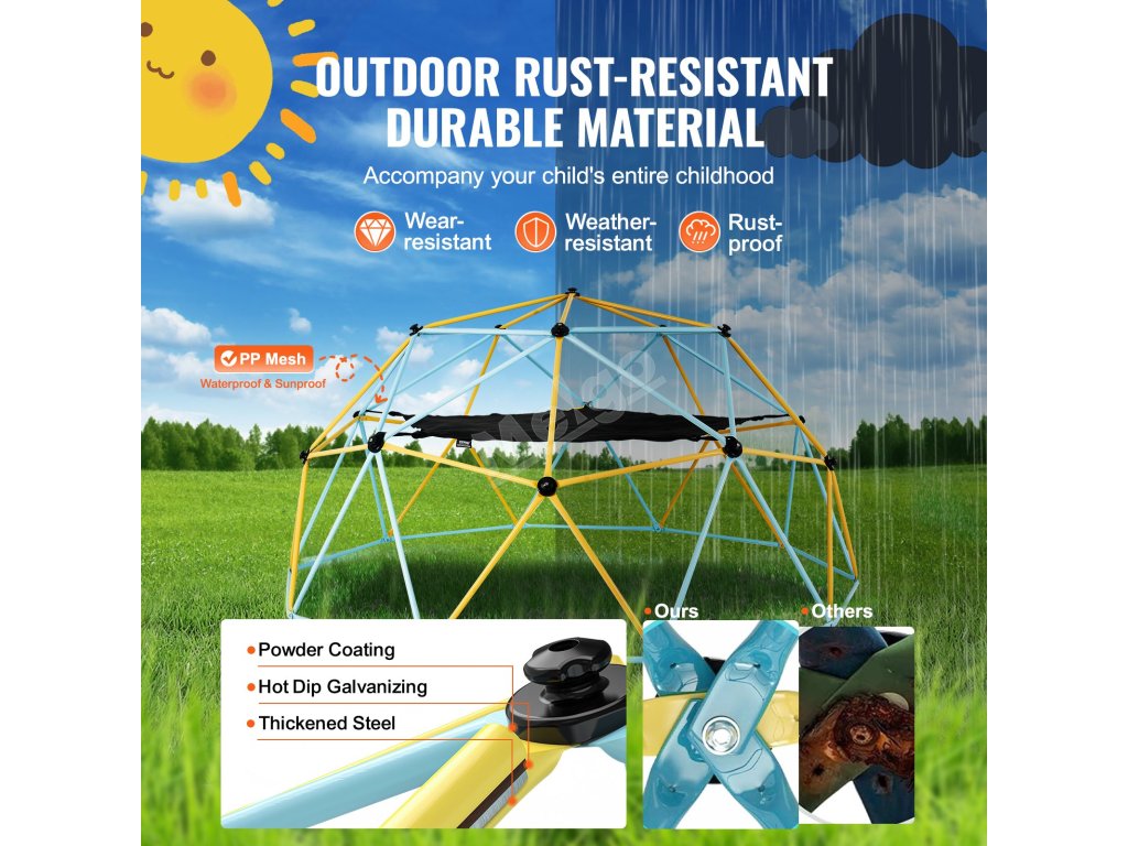Vnější lezecká kopule je vyrobena ze zesílené oceli a ošetřena technikou žárového zinkování a povrchovou úpravou, která poskytuje lepší ochranu proti UV záření, rzi a korozi. Houpací síť je vyrobena z nepromokavé a UV záření odolné PP síťoviny, takže je vhodná pro venkovní použití.