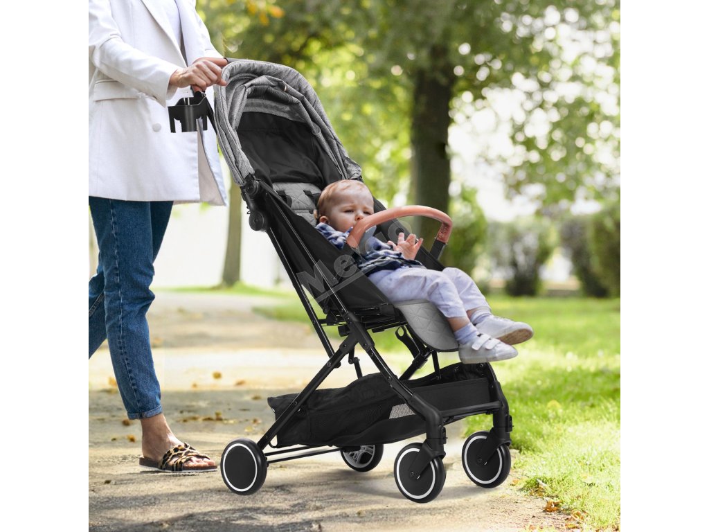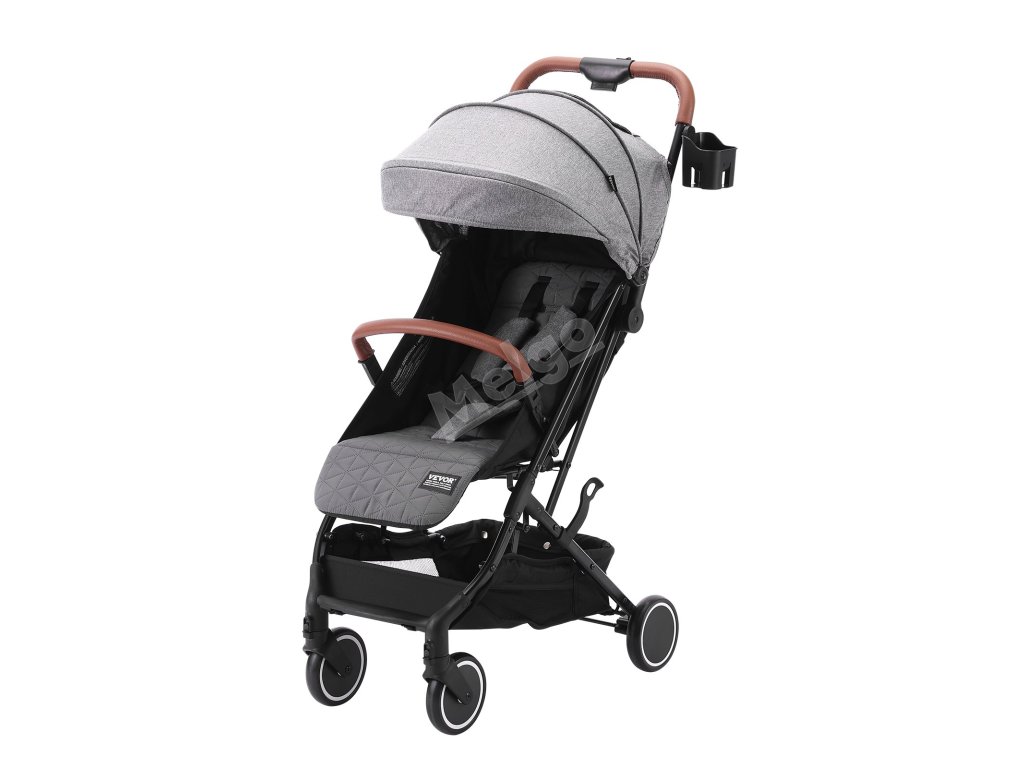 Dětský skládací kočárek, opěrka 95°–175°, nožní 0°/90°, držák, šedý