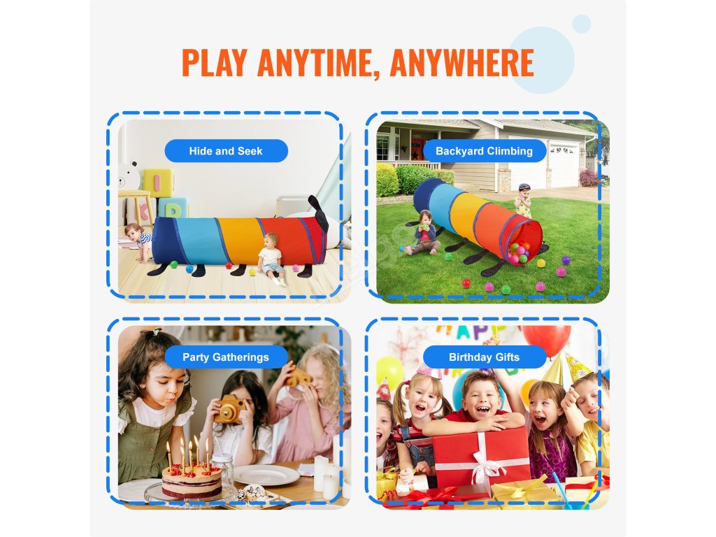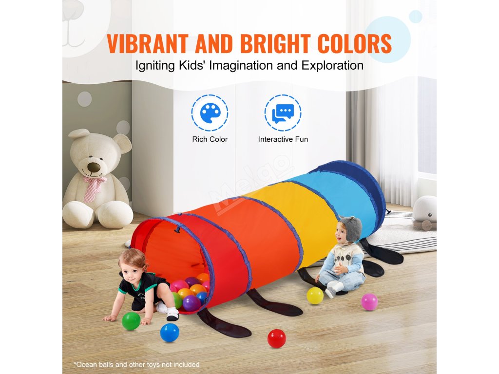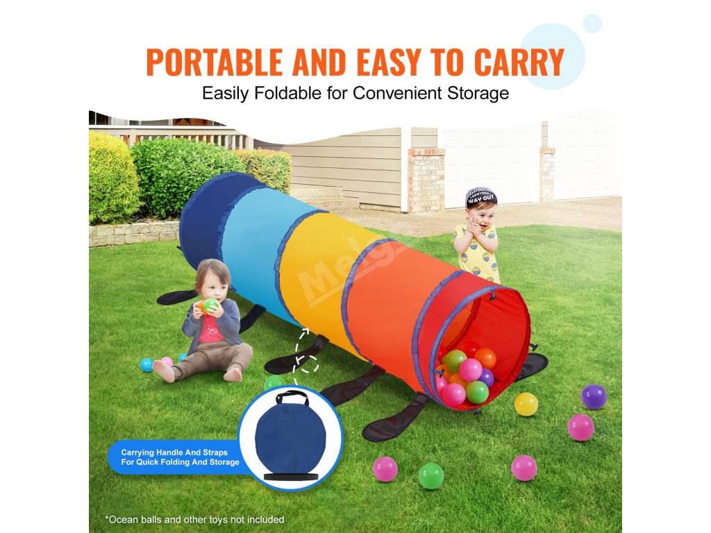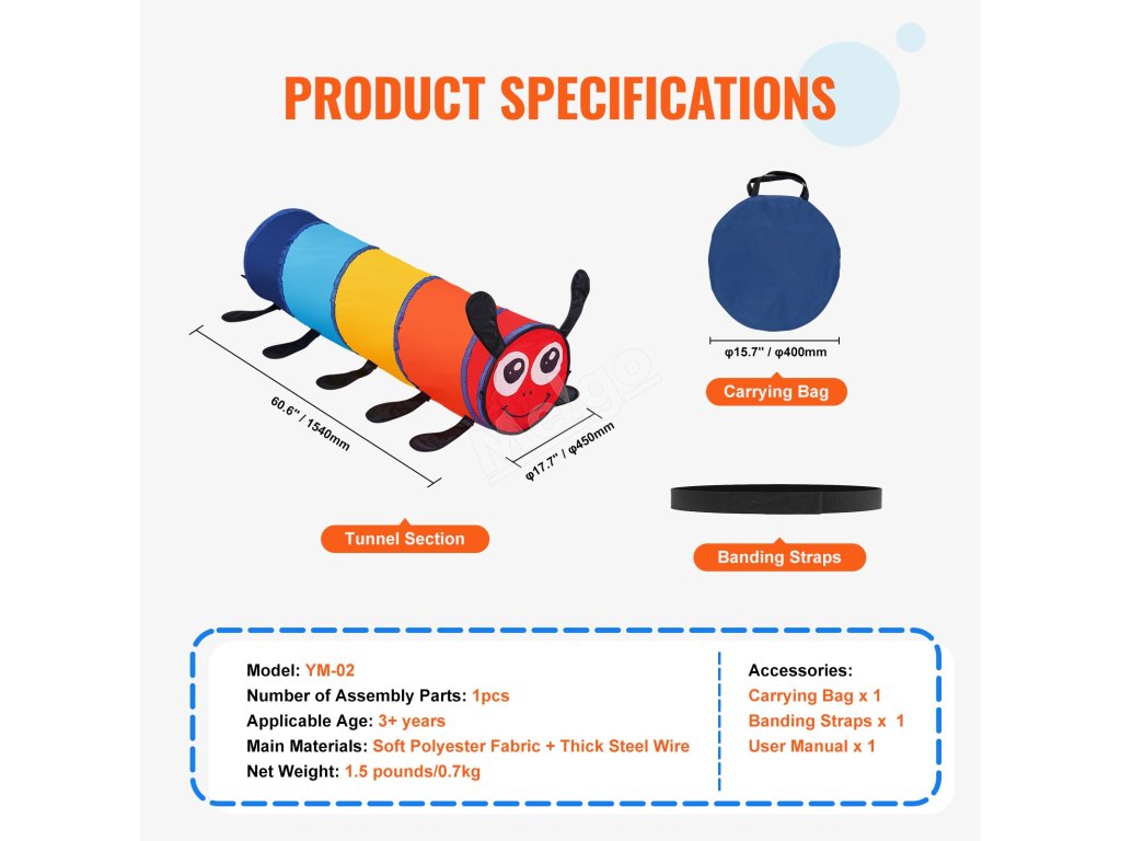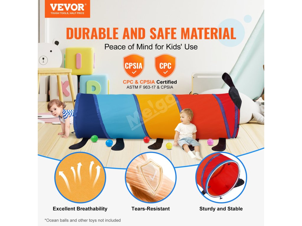Tunel je vyroben z měkké polyesterové tkaniny a robustní podpěry z ocelového drátu, nabízí pohodlí a stabilitu a splňuje normy CPSIA a certifikaci CPC, což zaručuje, že si děti mohou v tunelu bezpečně hrát.