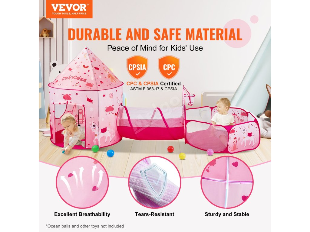 Tunel je vyroben z měkké polyesterové tkaniny a robustní podpěry z ocelového drátu, nabízí pohodlí a stabilitu a splňuje normy CPSIA a certifikaci CPC, což zaručuje, že si děti mohou v tunelu bezpečně hrát.