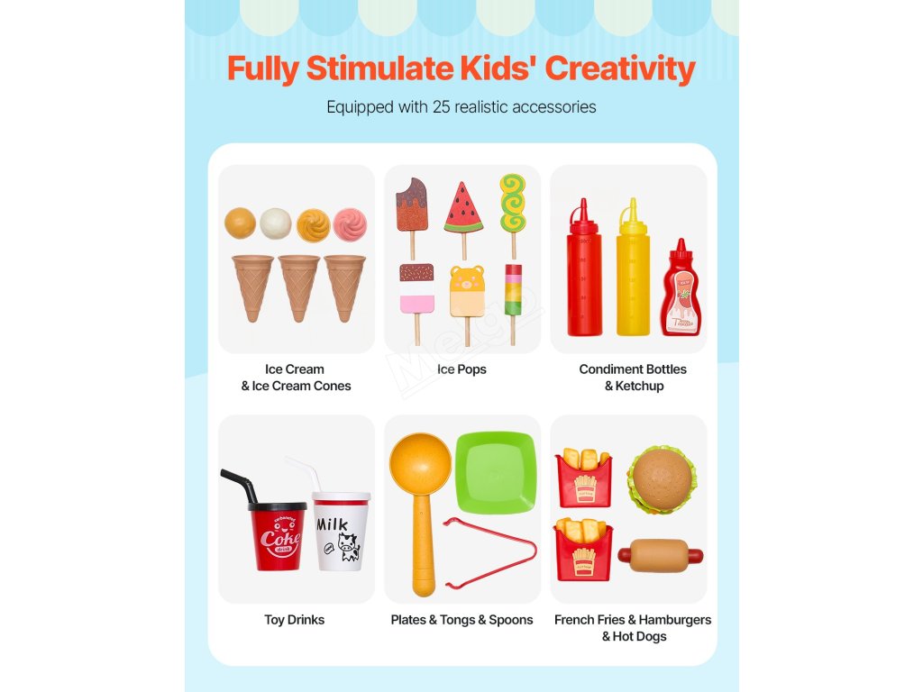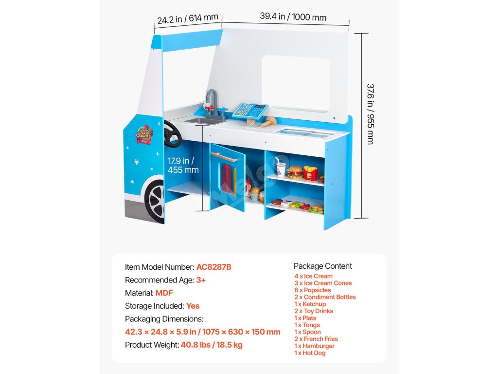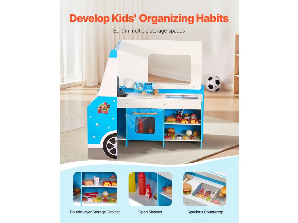 Řiďte zmrzlinářské auto a podávejte všechna oblíbená jídla - zmrzlinu, hot dogy a hamburgery! Díky spoustě úložného prostoru mohou děti udržovat pořádek a zároveň si užít spoustu zábavy.