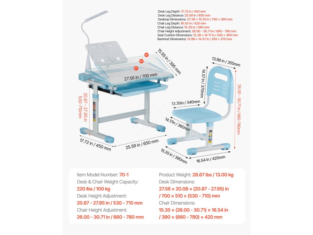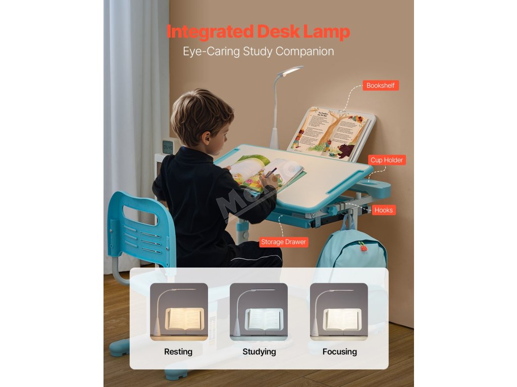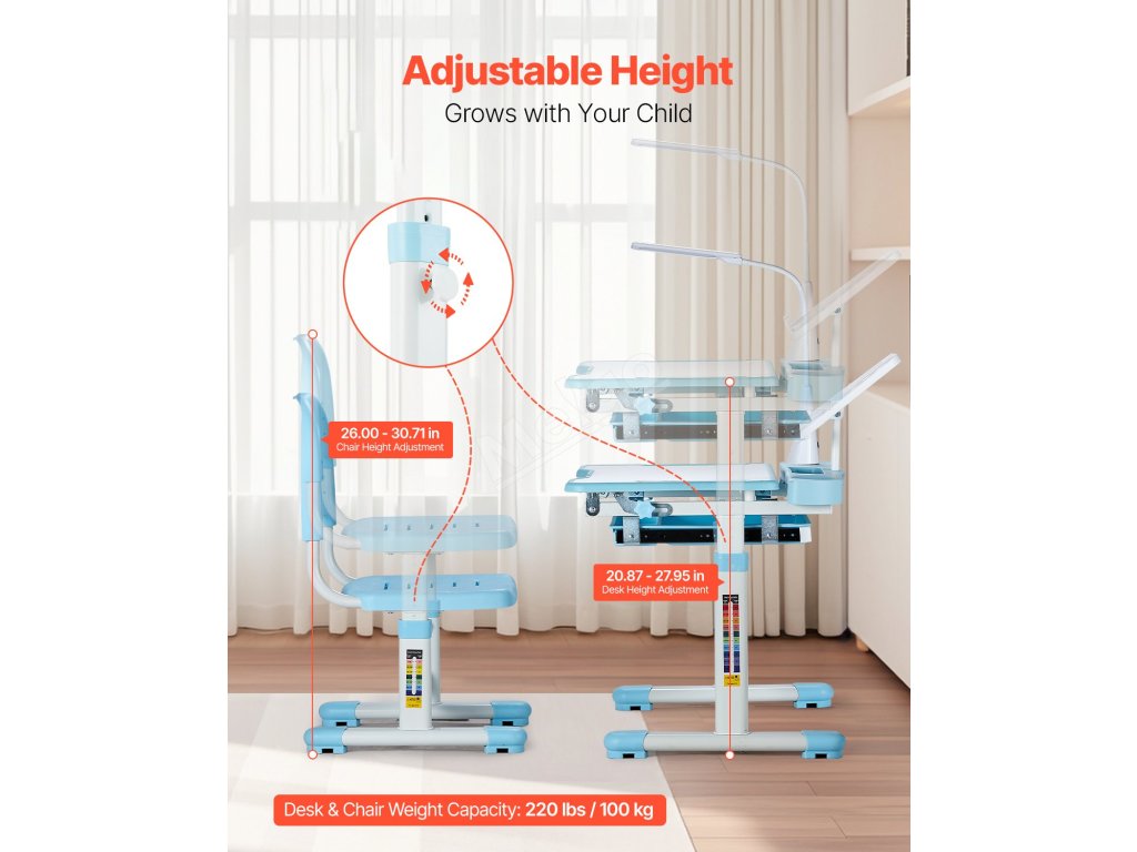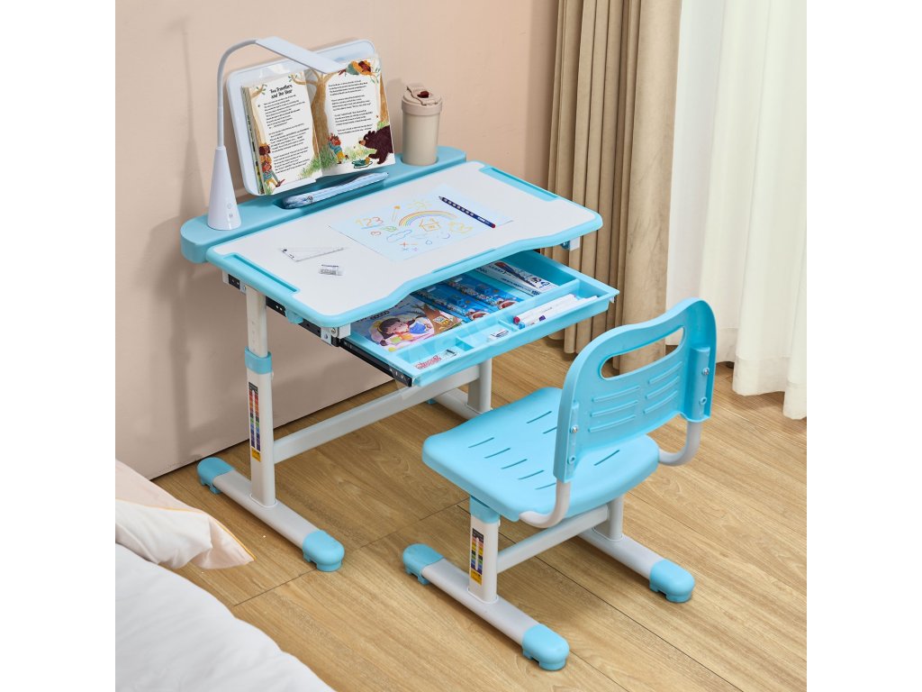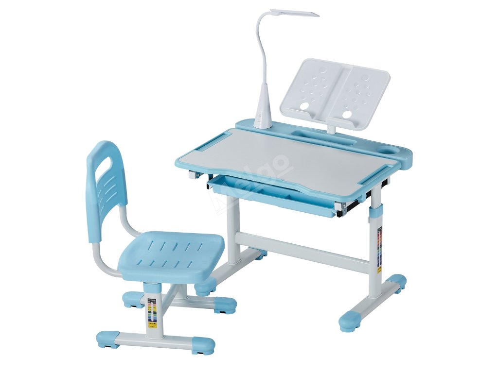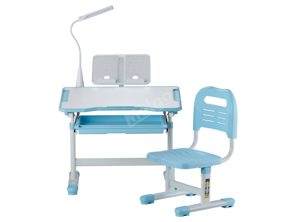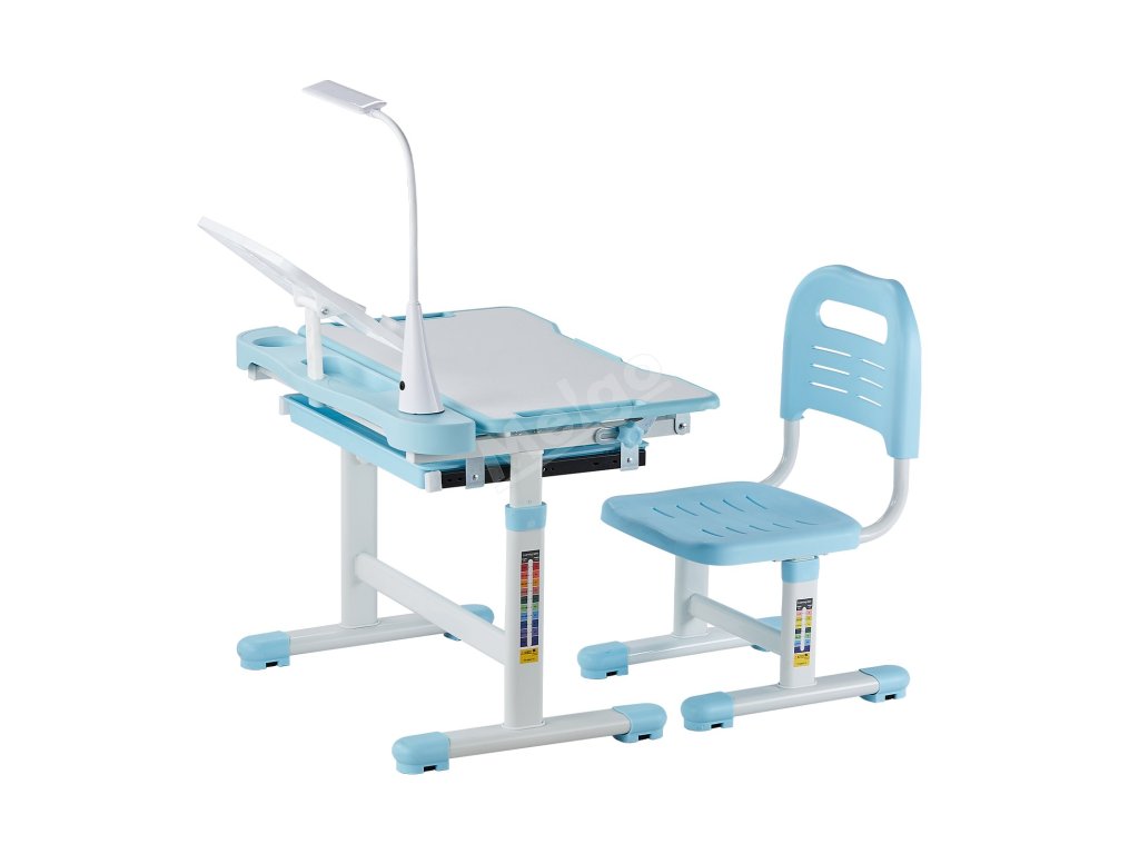 Dětský stůl a židle s lampou, nastavitelná výška, sklon 0–40°