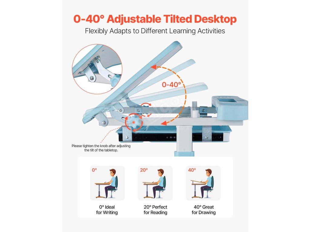 Desku stolu lze snadno naklonit v rozmezí 0° až 40°, abyste mohli psát, číst nebo kreslit. Tato flexibilita se nejen přizpůsobí různým činnostem, ale také podpoří vaše dítě v udržování zdravého a správného držení těla při sezení.