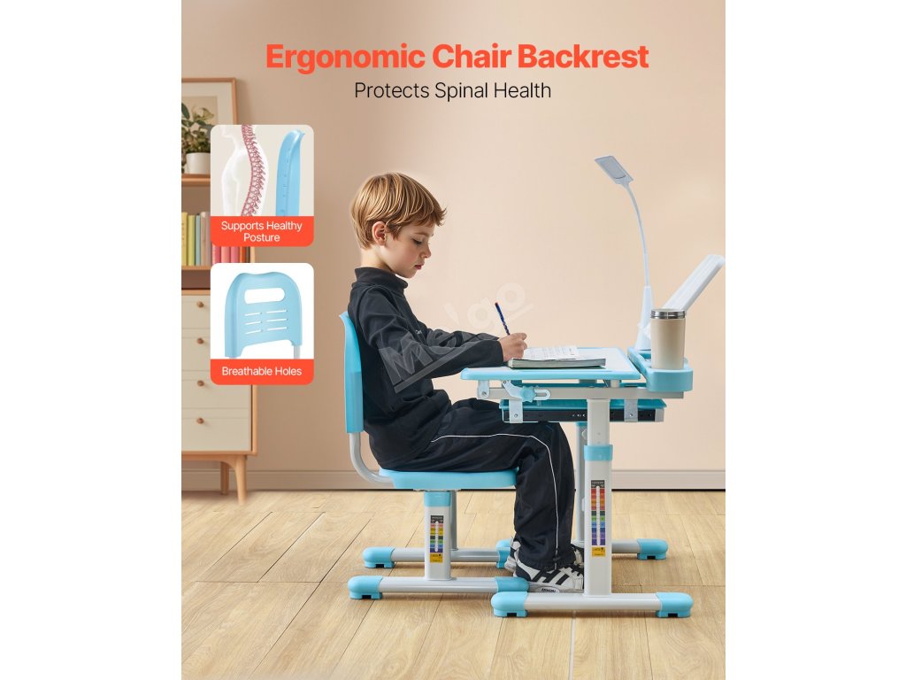 Dětský studijní stůl a židle jsou vybaveny funkcí výškového nastavení, která je v dokonalém souladu s ergonomickými zásadami. Pomáhá pěstovat správné návyky držení těla již od útlého věku a chrání zdraví páteře vašeho dítěte, až vyroste.