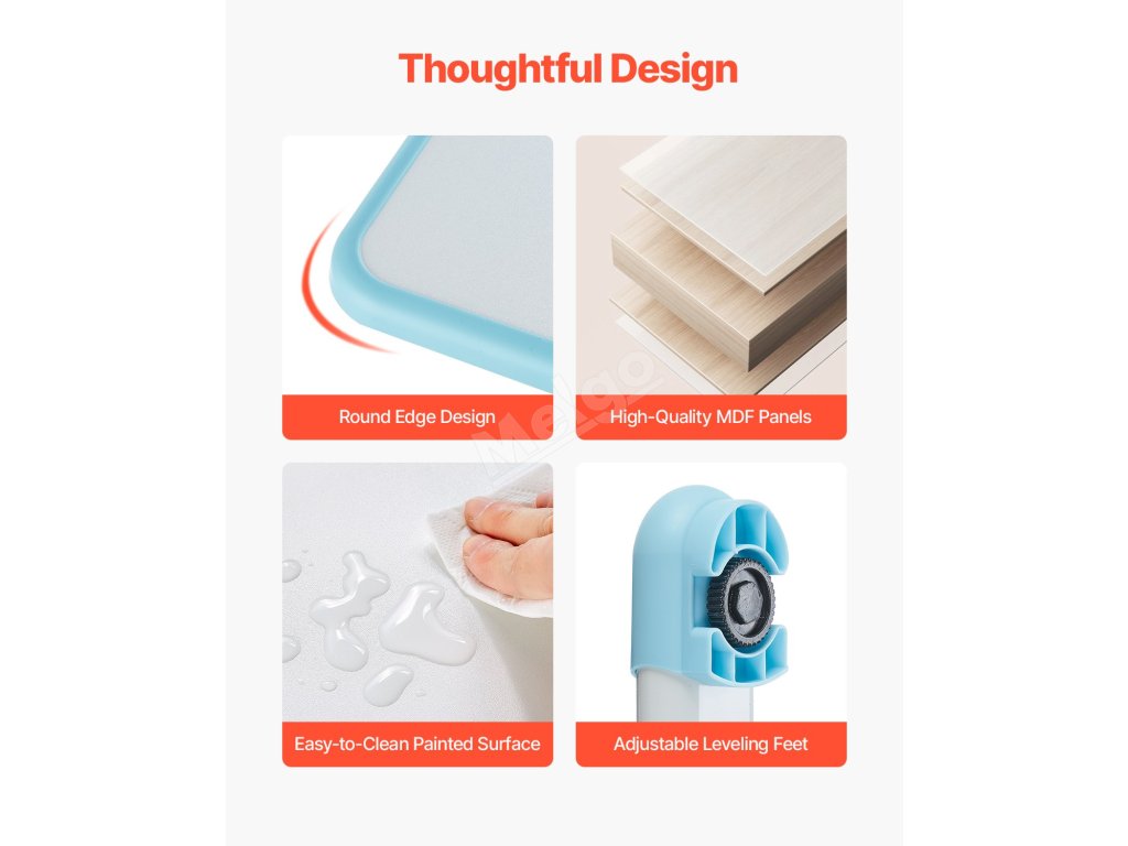 Tato sada studijního stolu a židle, navržená s ohledem na růst dětí, je vyrobena z vysoce kvalitních desek MDF a robustního ocelového rámu. Tato kombinace zajišťuje dlouhodobou stabilitu a odolnost, ať už se vaše dítě učí nebo si hraje.