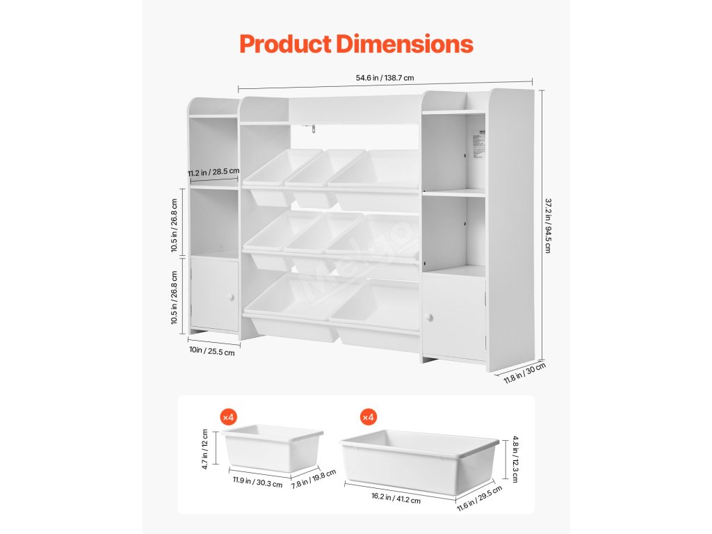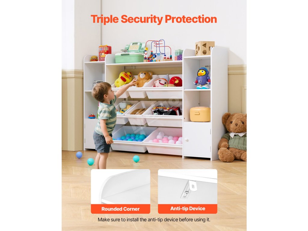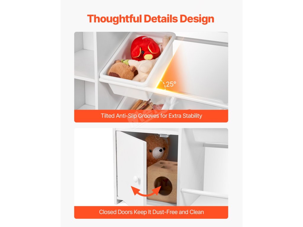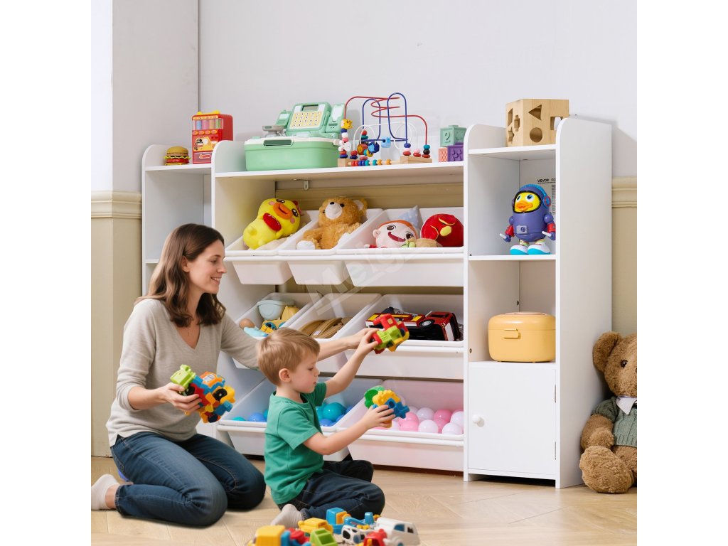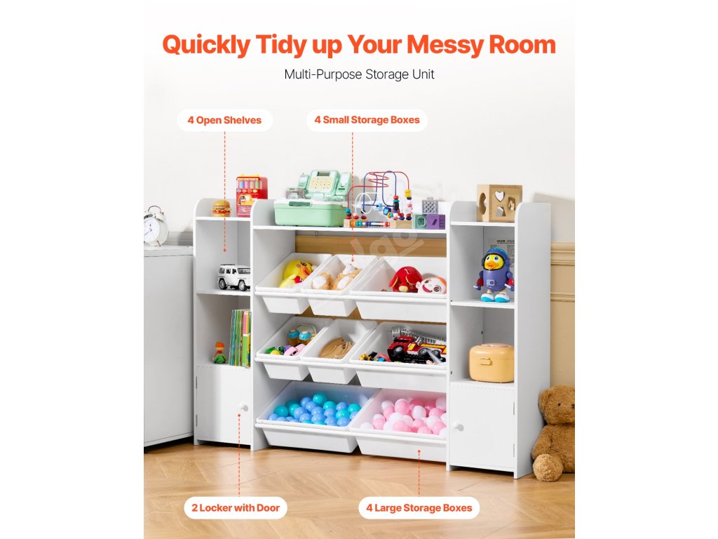 Tento dětský organizér na hračky kombinuje 4 otevřené police, 8 úložných boxů a 2 skříňky, které poskytují dostatek prostoru pro hračky, knihy, psací potřeby, sešity a další. Pomáhá udržovat vše přehledně uspořádané a snadno dostupné.