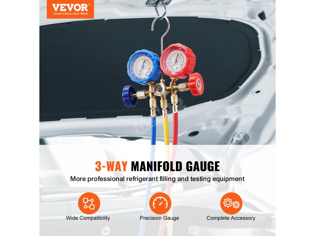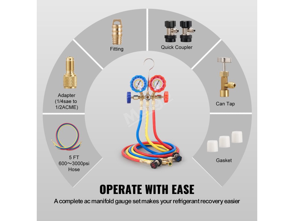 Súprava meradiel striedavého prúdu pre automobilový priemysel VEVOR obsahuje všetko, čo potrebujete. Obsahuje 3-cestný manometer, rýchlospojky, adaptér, kanistrový kohútik a hadice. Tento komplexný balík vám zjednoduší nastavenie a prevádzku bez nutnosti dokupovať ďalšie nástroje alebo príslušenstvo. Okrem toho sa uľahčuje regenerácia a plnenie chladiaceho zariadenia. Je ideálny pre začiatočníkov aj skúsených používateľov. Ušetrite čas a námahu s týmto komplexným riešením pre vaše úlohy v oblasti HVAC a údržby chladiva.