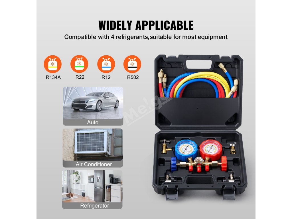 Súprava manometrov na meranie rozvodov striedavého prúdu VEVOR je všestranný nástroj na rôzne aplikácie. Pracuje s chladivami R134A, R22, R12 a R502. Vďaka tomu je vhodná na použitie v automobiloch, domácnostiach a komerčných zariadeniach. Môžete ho použiť na údržbu automobilovej HVAC, domácej klimatizácie alebo chladničky. Súprava obsahuje všetky potrebné príslušenstvo na rôzne úlohy. Táto všestrannosť vám zaručí, že budete mať správne náradie na zvládnutie akejkoľvek úlohy. Je teda nesmierne dôležitá pre domácich majstrov aj profesionálov. Vychutnajte si spoľahlivý výkon v rôznych aplikáciách s touto komplexnou súpravou manometrov na rozvody klimatizácie.