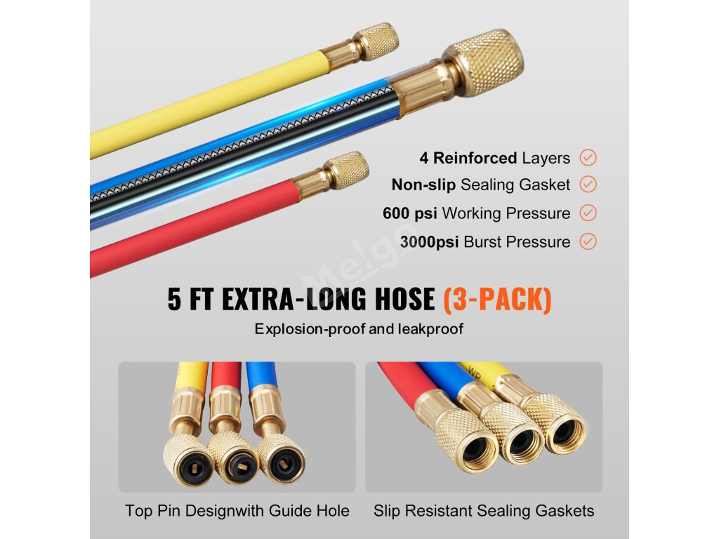 Táto súprava na plnenie freónom obsahuje tri zosilnené 5-stopové hadice. Tieto hadice sú vyrobené z PVC a majú štyri vrstvy zosilnenia pre tlaky do 600 psi a prasknú pri 3000 psi. To zaručuje odolnosť a bezpečnosť počas používania. Hadice sa dodávajú aj s protišmykovými tesniacimi tesneniami. Tieto tesnenia zabraňujú uvoľneniu a znižujú riziko úniku. Ich pevná konštrukcia poskytuje spoľahlivé spojenie, ktoré možno použiť pri všetkých úlohách údržby chladiacich zariadení. Či už pracujete doma alebo na profesionálne použitie, tento systém využíva tieto typy postrekovačov, ktoré vám poskytnú potrebnú pevnosť a flexibilitu.