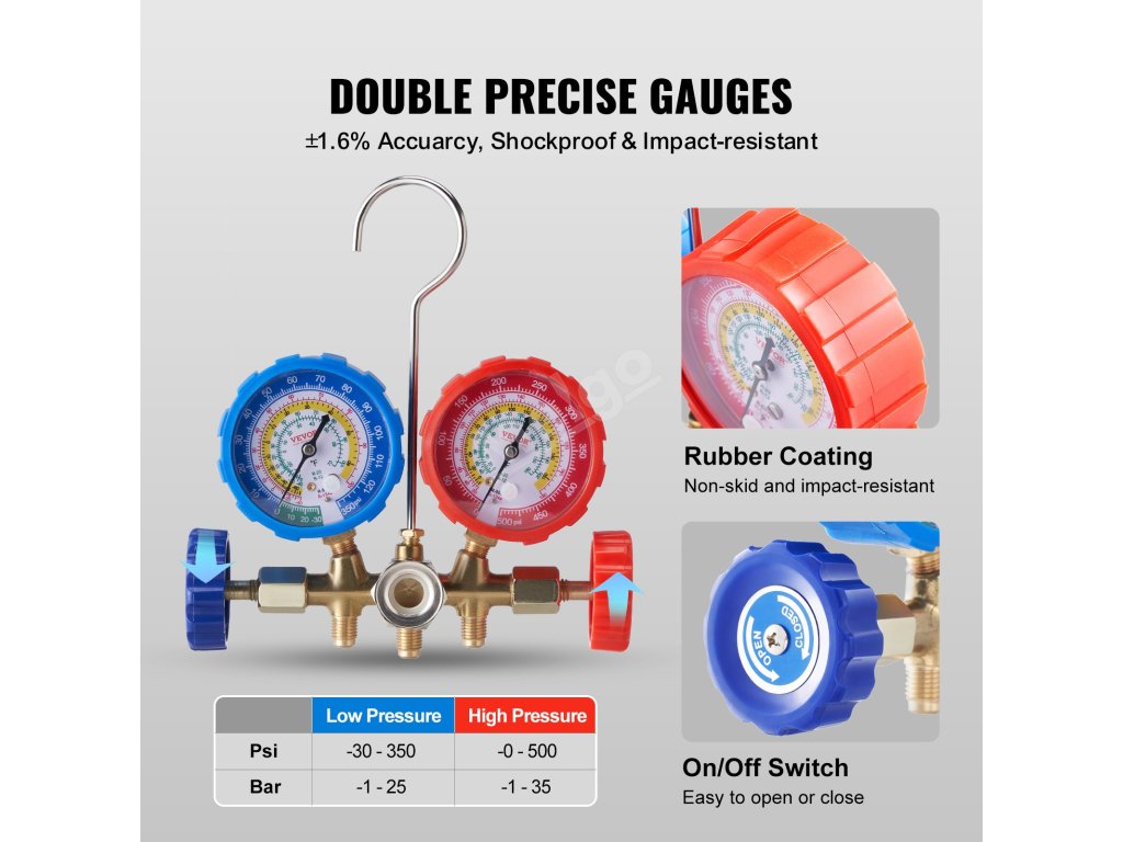 Súprava meracích prístrojov VEVOR na striedavý prúd v automobilovom priemysle má presné meracie prístroje na presné údaje. Manometre používajú suchú a kvapalinou plnenú konštrukciu, ktorá zlepšuje výkon, najmä v zime. Kalibračné skrutky zabezpečujú presnosť 1,6 %. To vám pomôže vyhnúť sa chybám počas používania. Konštrukcia s priezorníkom vám umožňuje vidieť prietok chladiva. Táto funkcia pomáha predchádzať chybám počas používania. Prehľadné a ľahko čitateľné manometre uľahčujú a zefektívňujú vaše úlohy. Spoľahlivé odčítacie systémy vám zaručia, že prácu vykonáte správne hneď na prvýkrát.