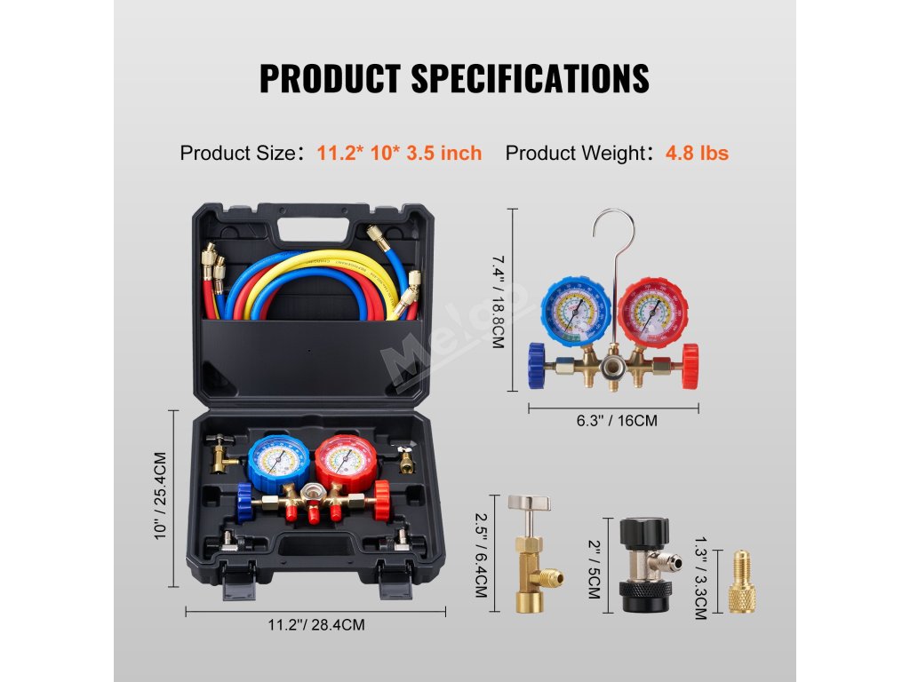 Tento merač chladiva R134A je vhodný na domáce aj profesionálne použitie. Poskytuje presnosť a odolnosť potrebnú na rôzne úlohy. Či už ste domáci majster alebo odborník, táto súprava splní vaše potreby. Vďaka používateľsky prívetivému dizajnu a komplexným funkciám je všestranne použiteľná. Použite ju na údržbu vzduchotechniky v aute, domácej klimatizácie alebo chladničky. S našou súpravou meracích prístrojov na klimatizáciu vykonáte prácu efektívne a s dôverou. Táto súprava sa vyznačuje spoľahlivosťou a presnosťou, aby ste všetko urobili efektívne. Je to nevyhnutný nástroj pre každého, kto sa zaoberá údržbou chladiacich zariadení. Poskytujeme spoľahlivý výkon v akomkoľvek prostredí.
