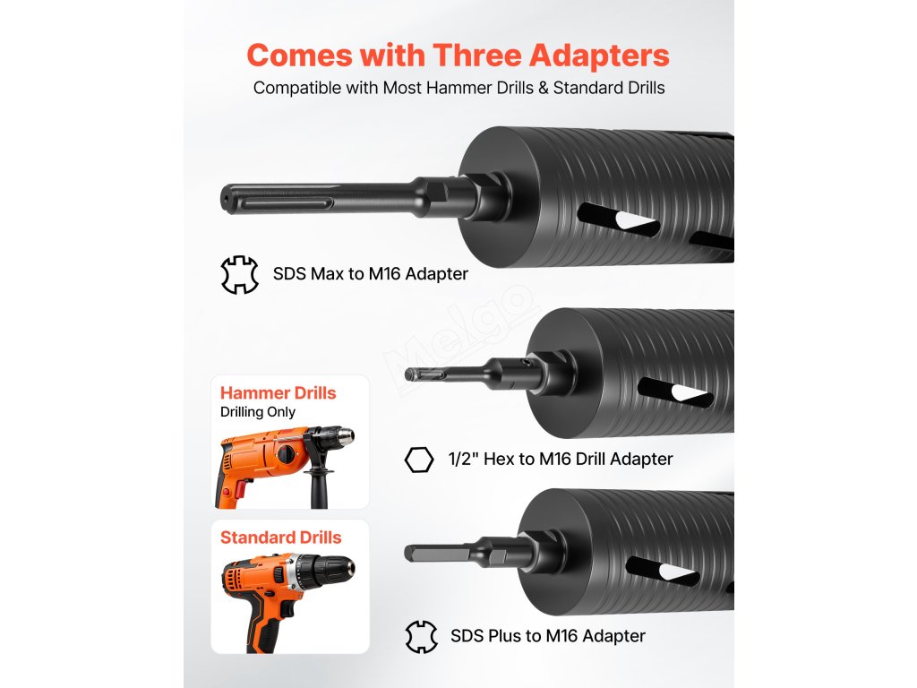 Naše diamantová korunková vrtačka za sucha obsahuje tři adaptéry pro snadnou kompatibilitu s vrtáky SDS Plus, SDS Max a šestihrannými vrtáky 1/2". Není třeba nic dokupovat - tato sada zvládne všechny vaše vrtací potřeby.