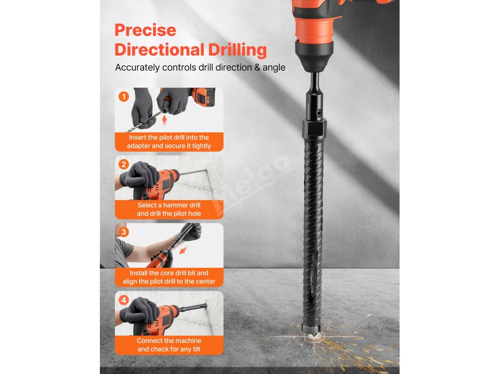 Tento diamantový jádrový vrták se snadno používá. Nejprve vložte pilotní vrták do adaptéru a ujistěte se, že úhel vrtáku odpovídá otvoru pro šroub adaptéru. Pevně utáhněte šrouby. Pro přesné vrtání musí být pilotní vrták vystředěný, s odchylkou maximálně 1 mm.