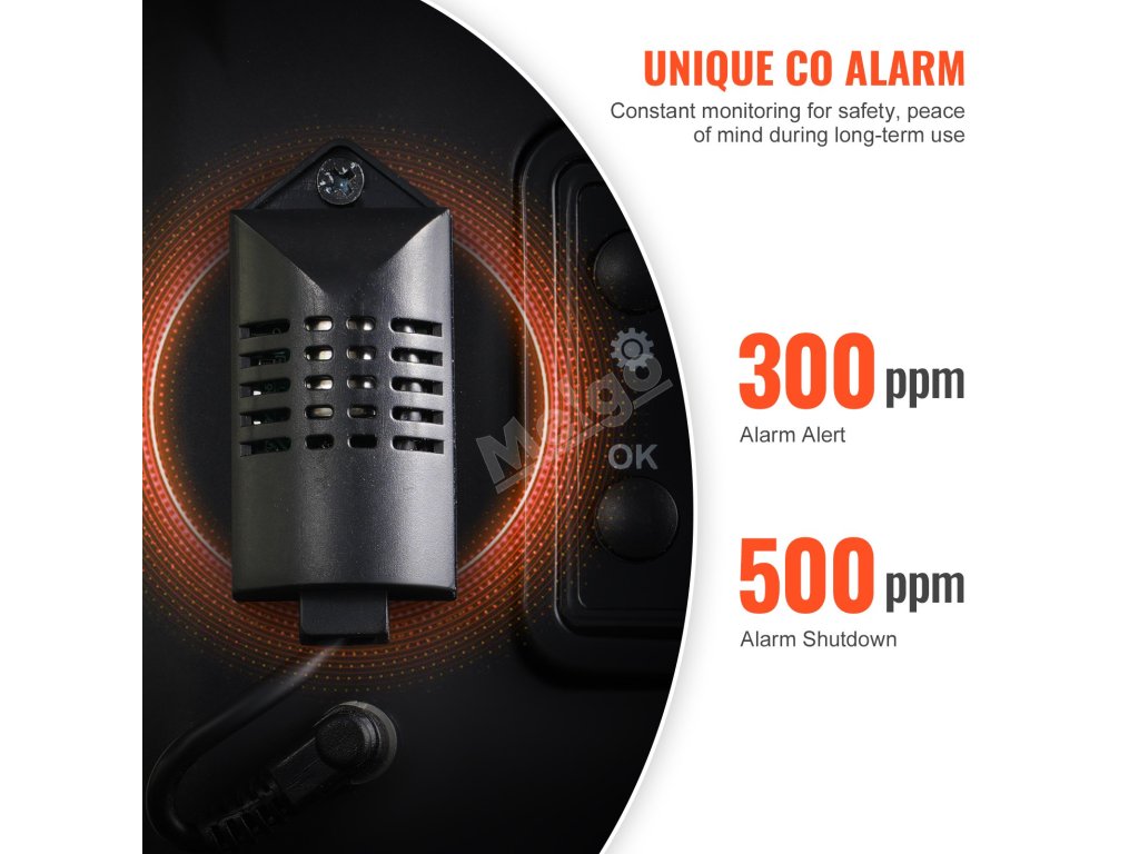 Tento naftový ohřívač vzduchu je vybaven inovativním alarmem CO a nepřetržitě monitoruje hladinu oxidu uhelnatého. Alarm se spustí při 300 ppm a automatické vypnutí při 500 ppm, aby se zabránilo otravě CO z nedokonalého spalování.