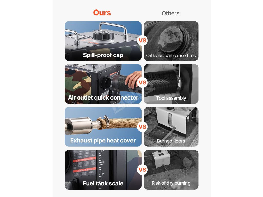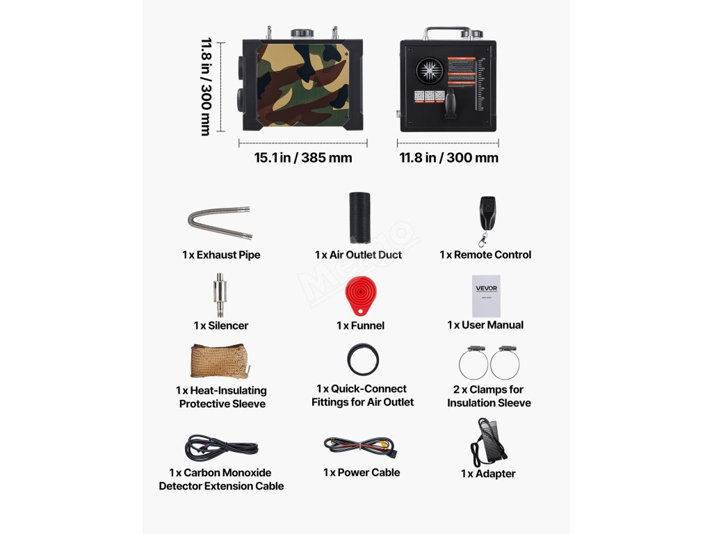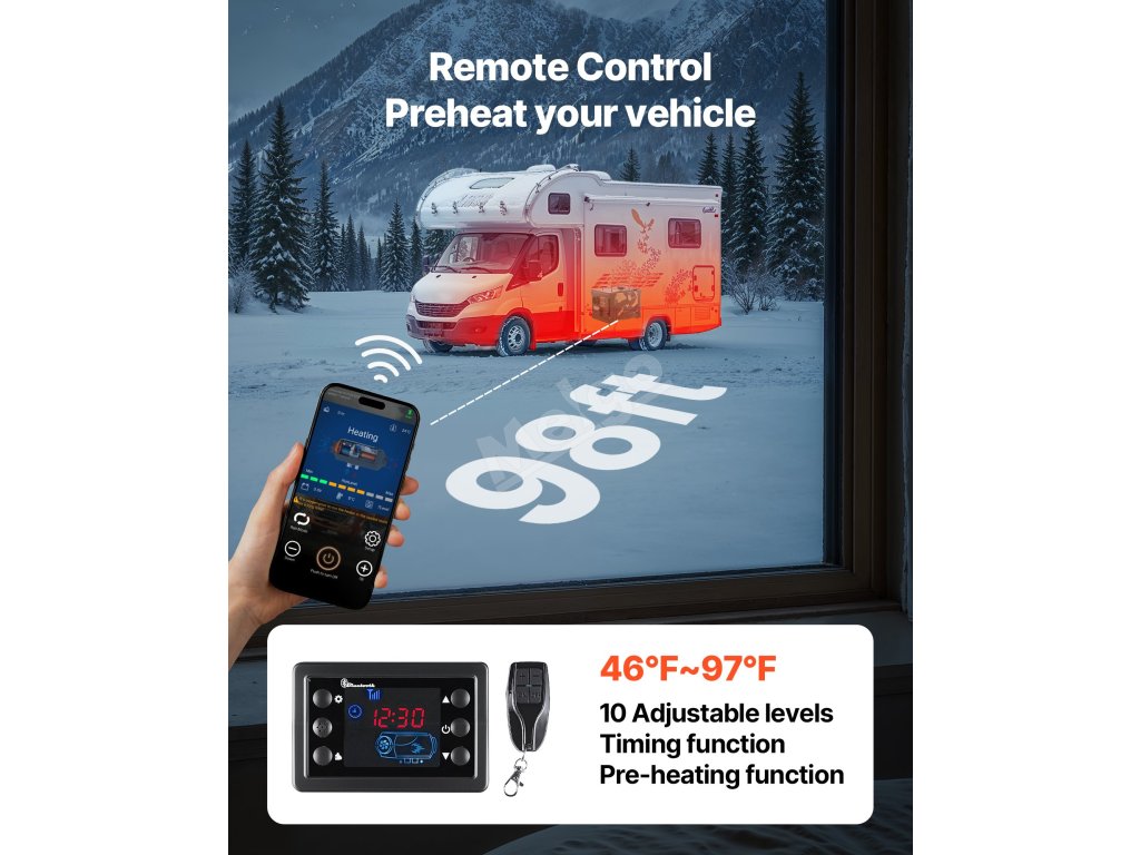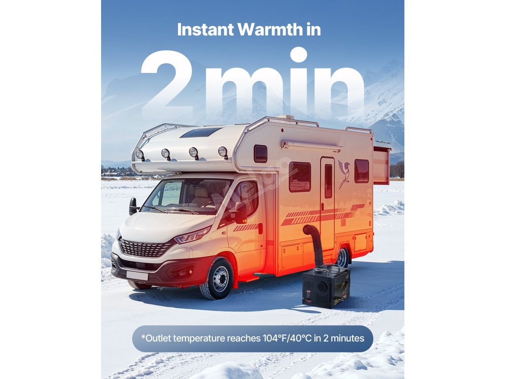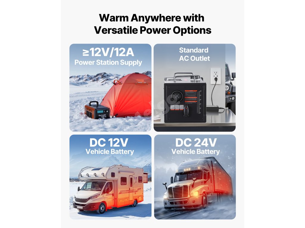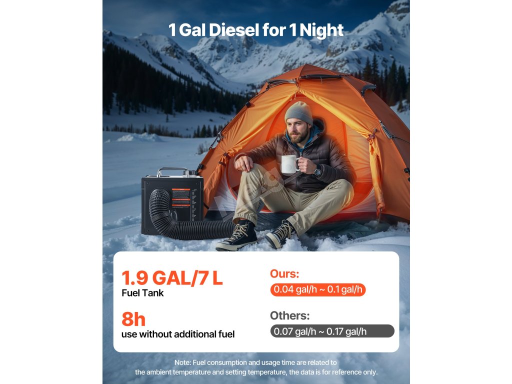 Tento přenosný naftový ohřívač o výkonu 8 kW se připojuje k napájení vozidla a obsahuje adaptér pro napájení z rozvodny nebo domácnosti střídavým proudem. Poskytuje rychlé a účinné vytápění pro stany, rybaření na ledu, obytné vozy, nákladní automobily, SUV, dodávky a další. Je navrženo tak, aby zvládalo chladné prostředí a rychle vyhřívalo velké prostory.