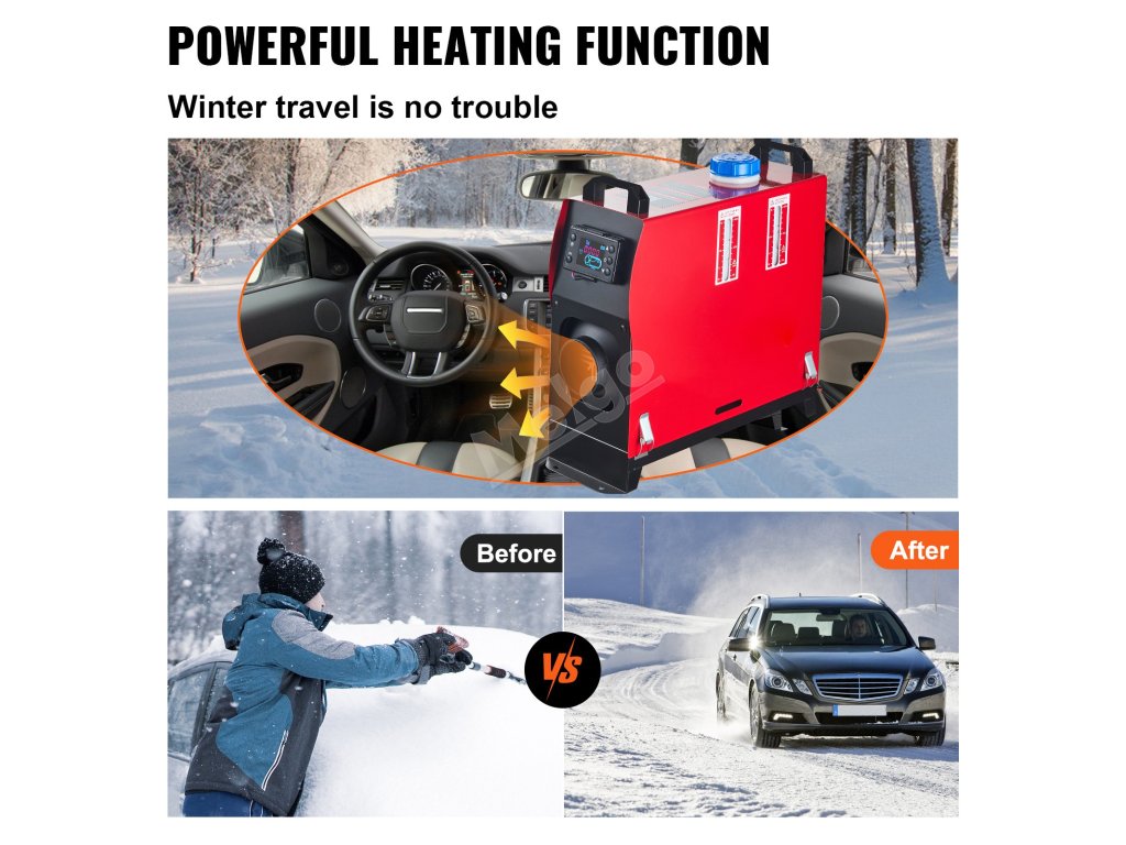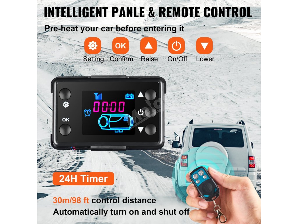 Parkovací topení s digitálním LCD monitorem umožňuje manuální/automatický režim nastavení teploty. Pomocí funkce časovače můžete také přednastavit čas zapnutí topení a předehřát vozidlo pomocí dálkového ovladače.